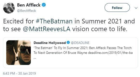 Al compartir el informe que afirmaba que el actor estaba dejando atrás la franquicia, Affleck agregó: "Emocionado por The Batman en el verano de 2021 y por ver la visión de Matt Reeves cobrar vida."