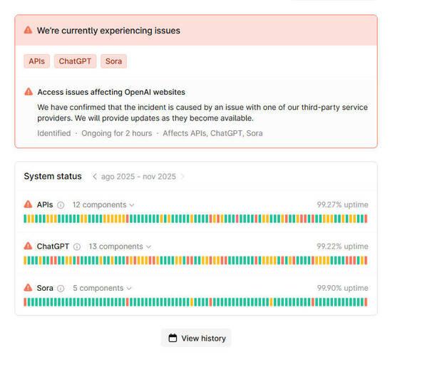 La propia OpenAI confirmó en su página de estado que estaban monitoreando el problema por parte de un proveedor de terceros (Cloudflare), el cual afectaba tanto a la versión web (ChatGPT Plus y Free) como a las integraciones por API.