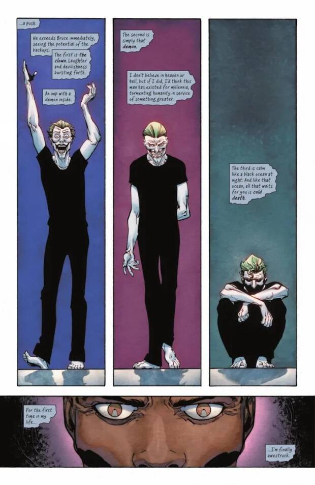 Los tres Jokers resultan ser tres personajes distintos que Joker creó mientras trabajaba con Captio: el payaso, el demonio, descrito por Captio como "no creo en el cielo ni en el infierno, pero si lo hiciera, pensaría que este hombre ha existido durante milenios, atormentando a la humanidad al servicio de algo mayor" y el asesino, descrito como "calma como un océano negro en la noche y como ese océano, todo lo que te espera es una muerte fría".