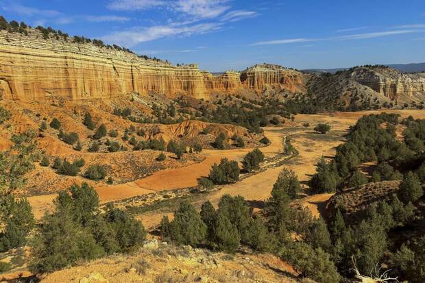 A poco más de veinte minutos en coche desde la ciudad de Teruel, surge un escenario que bien podría haber sido arrancado de las postales del oeste de Estados Unidos: el Cañón Rojo de Teruel, conocido también como la Rambla de Barrachina. Sus paredes rojizas, en torno a 50 metros de altura, se extienden a lo largo de aproximadamente diez kilómetros, lo que lo convierte en un rival español al icónico Grand Canyon de Arizona en cuanto al impacto visual. La propia prensa lo ha descrito como “la joya turolense que ofrece una imagen del Cañón del Colorado sin salir de España”.