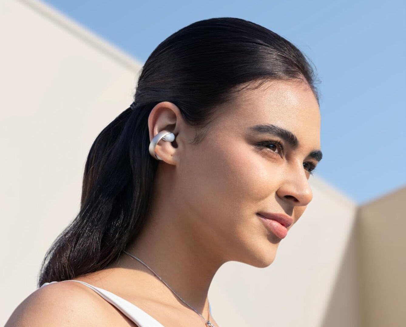 Los AeroClip van por otro camino con su diseño tipo pendiente elegante hecho de alambre de titanio finísimo que aguanta 20.000 dobleces. Nadie nota que los llevas en las videollamadas del trabajo, y sus altavoces más pequeños con tecnología de graves virtuales suenan mejor que otros auriculares que no tapan el oído. Duran 8 horas seguidas y 32 con la caja, suficiente para todo un día de trabajo sin preocuparte por la batería. La parte que va en la oreja es más pequeña y cómoda, aunque se recomienda un descanso después de 4 horas seguidas de uso.