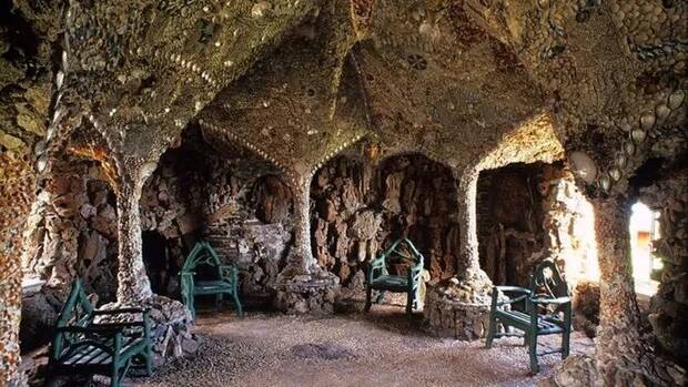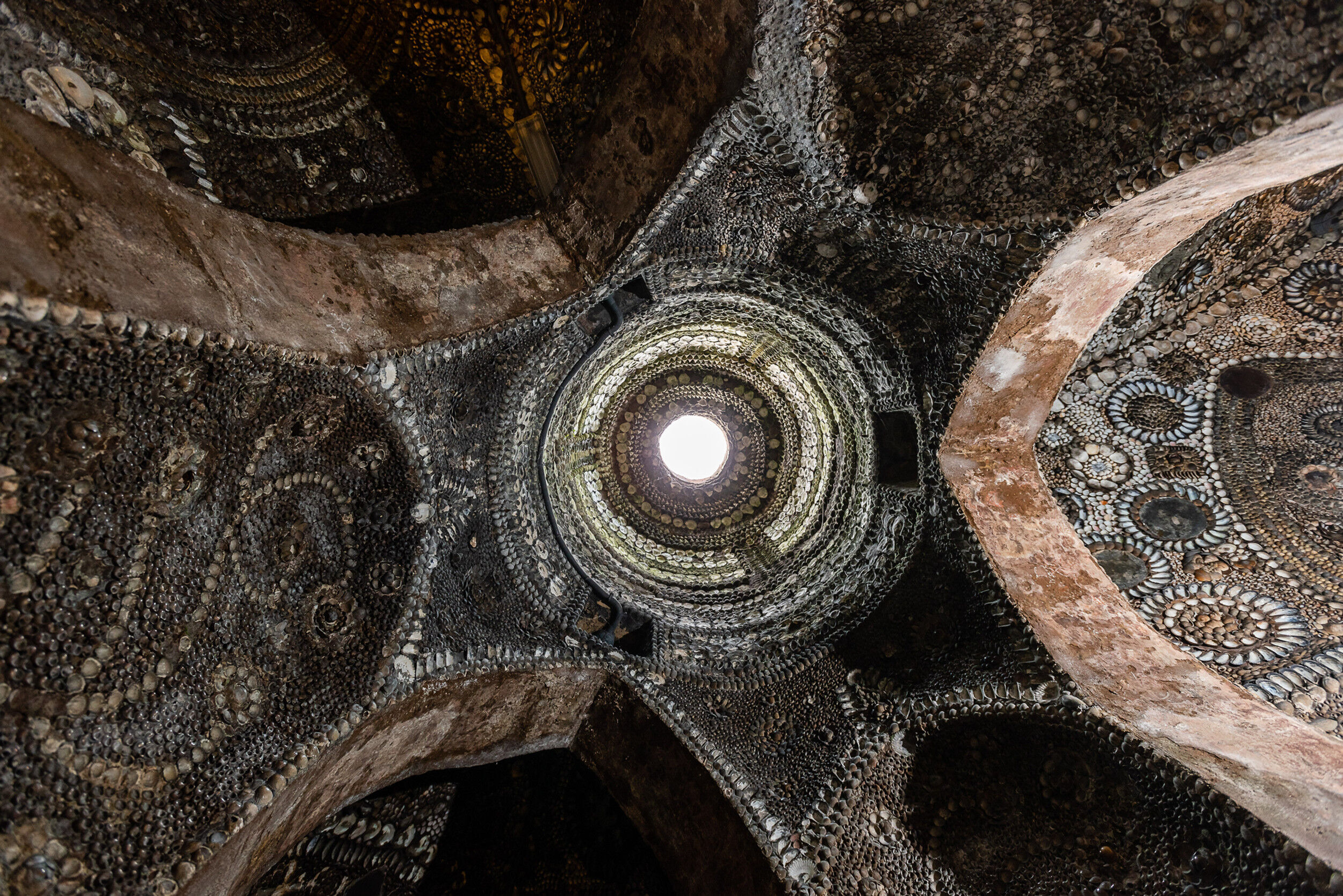 Lo que convierte el lugar en un rompecabezas es su “piel”: paredes y bóvedas cubiertas por mosaicos hechos con unos 4,6 millones de conchas, hasta sumar alrededor de 2.000 pies cuadrados (en torno a 185–190 m²) de superficie decorada. No son conchas exóticas traídas de ultramar, sino especies comunes de la costa, colocadas con paciencia para dibujar rosetas, bandas geométricas y símbolos que no encajan con un catálogo único y reconocible.