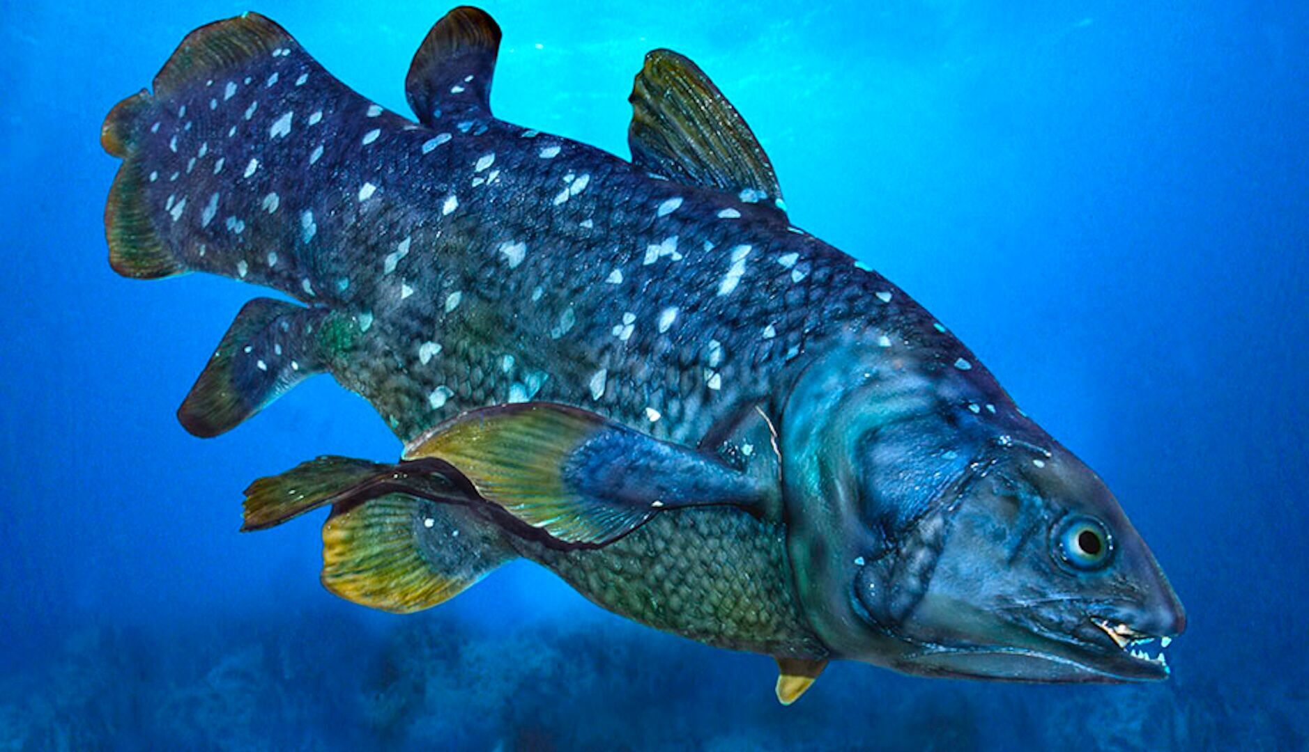 El celacanto, Latimeria menadoensis, había sido considerado extinto hasta que un ejemplar apareció frente a Sudáfrica en 1938. Desde entonces, solo se conocen dos especies vivas, Latimeria chalumnae y L. menadoensis, que habitan entre 100 y 400 metros de profundidad. Su anatomía conserva rasgos ancestrales: aletas carnosas semejantes a extremidades, cráneo bifurcado y pulmón vestigial, elementos que ofrecen pistas sobre la transición evolutiva del mar a la tierra.