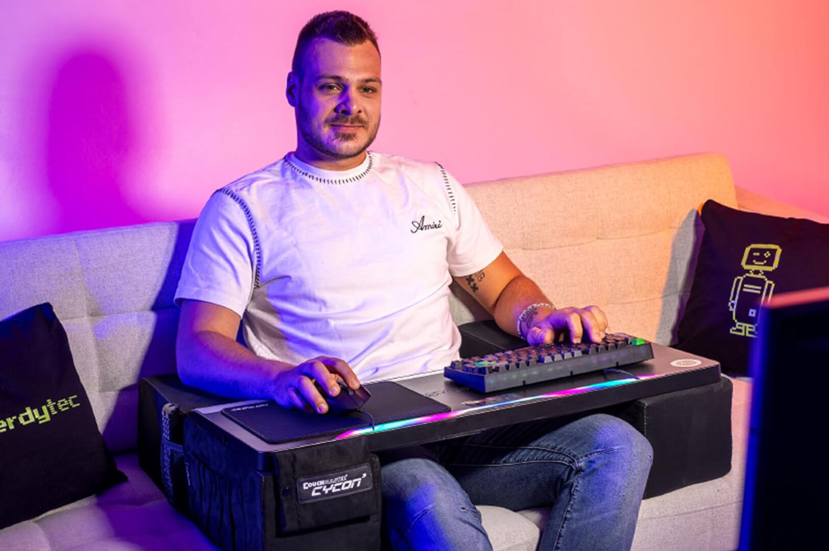 Como complemento ideal (se vende por separado), Nerdytec ofrece el Cyback, un cojín ergonómico de espuma viscoelástica que proporciona soporte lumbar específico para prevenir fatiga durante largas horas. Este accesorio también cambia completamente el “juego”, haciendo que cualquier sofá se convierta en tu oficina definitiva.