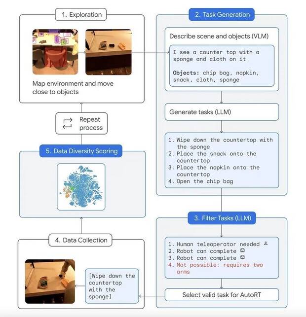 En las pruebas de Google, el sistema de recolección de datos de la compañía, AutoRT, utiliza un modelo de lenguaje visual (VLM) y un modelo de lenguaje grande (LLM) para comprender su entorno, adaptarse a entornos desconocidos y decidir sobre tareas apropiadas.