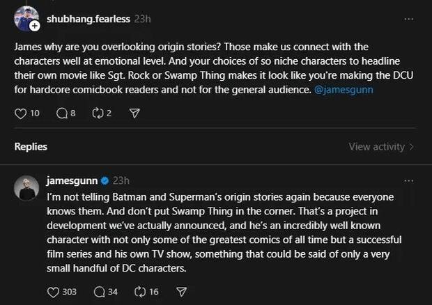 Según Gunn, estas historias ya son ampliamente conocidas por el público y no necesitan ser revisitadas nuevamente. "No voy a volver a contar las historias de origen de Batman y Superman porque todo el mundo las conoce. No dejen a La Cosa del Pantano en un rincón. Ese es un proyecto en desarrollo que de hecho hemos anunciado, y es un personaje increíblemente conocido que no solo tiene algunos de los mejores cómics de todos los tiempos, sino también una exitosa serie de películas y su propio programa de televisión, algo que solo se podría decir de un puñado muy pequeño de personajes de DC", apuntó Gunn en Threads.