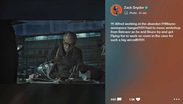 En la imagen que ha compartido Zack Snyder en la plataforma Vero, se puede ver a Irons trabajando en los guanteletes de Batman. Sin embargo, lo verdaderamente llamativo no es lo que está haciendo Pennyworth, sino dónde está: Snyder ha confirmado que Alfred no se encuentra en la Batcueva, sino trabajando en una mesa ubicada en el "colgador aeroespacial Wayne".