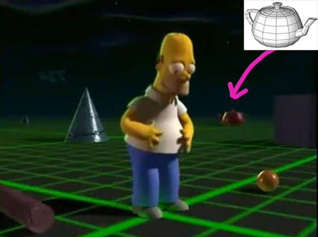 Otra referencia sutil pero significativa es la aparición de una tetera en el paisaje tridimensional, una alusión al "Utah Teapot" o Tetera de Utah, un modelo 3D creado por el investigador Martin Newell en 1975 y utilizado como estándar en gráficos por computadora. Este objeto se ha convertido en un icono dentro de la comunidad de gráficos por computadora, y su inclusión en "Homer³" es un homenaje a los orígenes de la animación 3D. También se muestra una ecuación cosmológica que describe la densidad del universo de Homer, (ñm0 > 3 H 0 2/ 8p G ), insinuando su eventual colapso debido a la alta densidad gravitacional, una inserción que mezcla humor y ciencia de manera brillante. De hecho, esto es exactamente lo que sucede hacia el final del capitulo.