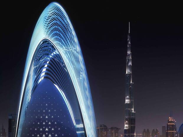 De vuelta al lujo de Dubái, la fachada del edificio de 65 pisos, que ha costado mil millones de dólares, será de forma elíptica, de vidrio, como con forma de bala, y su altura imponente de aproximadamente 341 metros, cuando el Empire State de Nueva York tiene 381.
