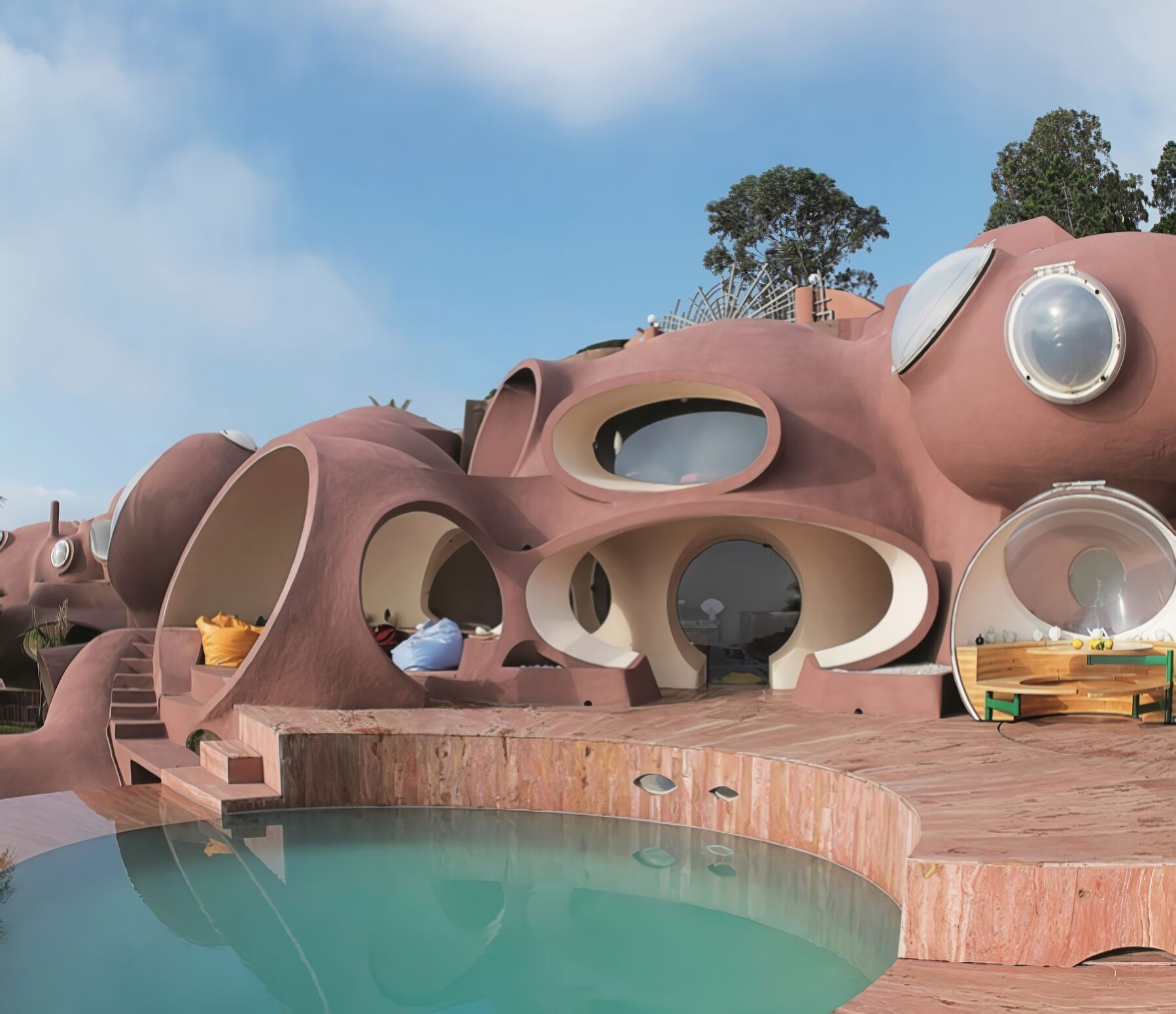 Lo verdaderamente interesante es que esta forma no era una excentricidad decorativa, sino una posición arquitectónica. Lovag defendía que la línea recta era una agresión contra la naturaleza y hablaba de su trabajo como una arquitectura “espontánea, alegre y llena de sorpresa”. En el Palais Bulles, esa idea se traduce en superficies curvas continuas, aberturas circulares y una organización espacial donde las cargas y las tensiones no se resuelven como en una vivienda convencional de pilares, tabiques rectos y habitaciones ortogonales. No es solo una casa rara: es una casa concebida contra el vocabulario habitual de la construcción residencial.