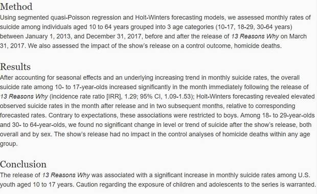 El dato aparece en abril de 2017, prácticamente coincidiendo con el debut de la primera temporada de Por 13 Razones, y se corresponde con 195 muertes más por suicidio entre el 1 de abril y el 31 de diciembre de ese año. El estudio ha estado respaldado por diversas universidades y hospitales de Estados Unidos.