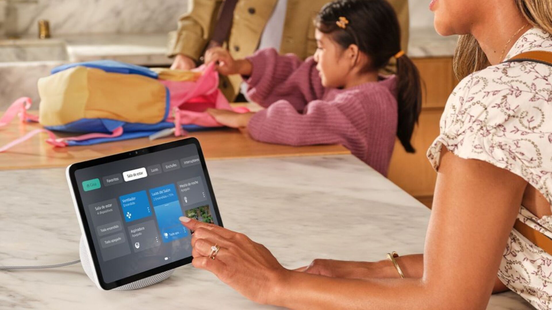La base ajustable, que se vende por separado por 39,99 euros adicionales, permite modificar el ángulo y la altura del dispositivo para adaptarlo a diferentes espacios como la cocina o el escritorio.