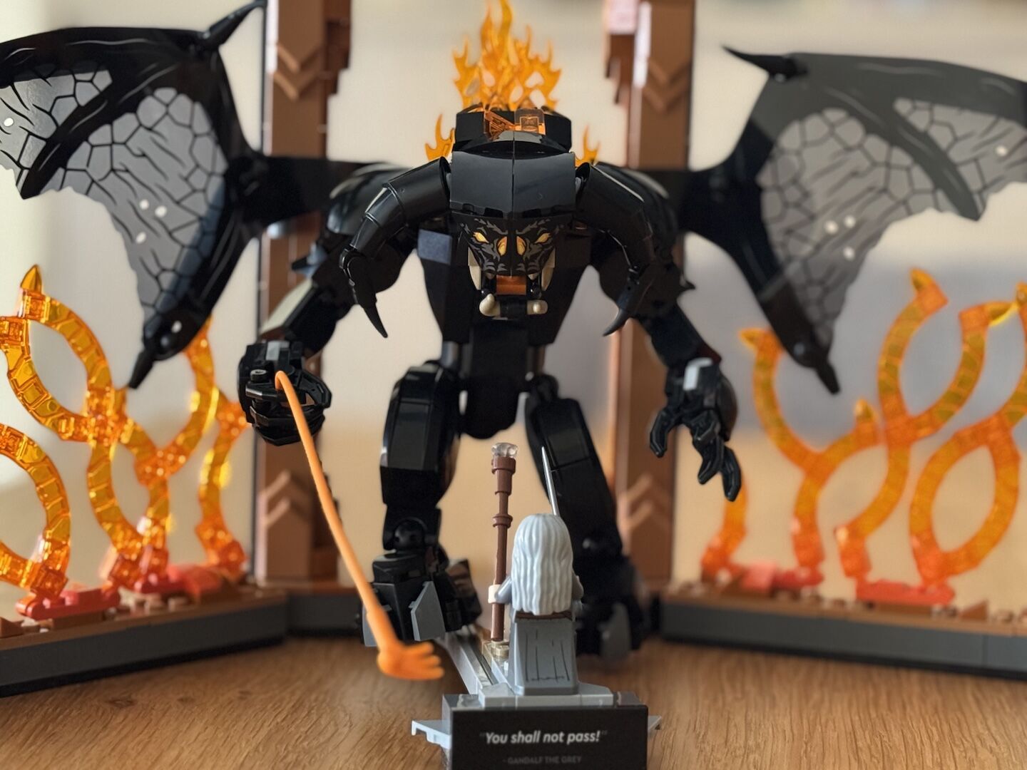 El Balrog, por supuesto, es el gran protagonista: sus alas extendidas, su látigo de fuego y su imponente figura negra con toques naranjas parecen salidos directamente del infierno de Morgoth. No es fácil representar con LEGO un ser tan abstracto, tan envuelto en sombra y llamas, y sin embargo aquí está, sólido y reconocible. Su construcción es un tanto monótona, quizás por culpa del exceso de negro del ser, pero una vez ensamblado impone.