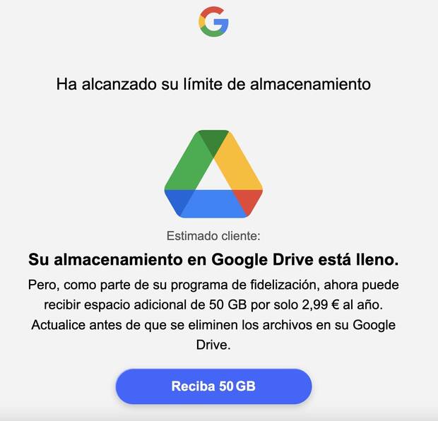 Los ciberdelincuentes se las saben todas y para cazar a sus victimas, en muchas ocasiones utilizan los nombres de grandes compañías tecnológicas. En esta ocasión, este nuevo caso de phishing se hace pasar por Google y avisa sobre Google Drive, con un correo electrónico que promete 50 GB adicionales de almacenamiento de manera gratuita. Este mensaje, que parece provenir de la compañía, es en realidad un intento de estafa que busca obtener información personal y financiera de los usuarios. El correo asegura que el espacio de almacenamiento está lleno y ofrece un enlace para ampliarlo, pero en realidad redirige a una página web fraudulenta. Este tipo de ataques son cada vez más comunes, aprovechando la confianza que los usuarios tienen en servicios populares como Google Drive.