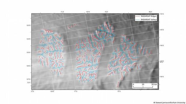 A través de la técnica de radiosondeo, un avión envió ondas de radio al hielo y analizó los ecos para revelar las formas subyacentes. Este método permitió descubrir un paisaje fluvial con valles pronunciados y colinas puntiagudas, similar a regiones montañosas en la Tierra, como Snowdonia en Gales.