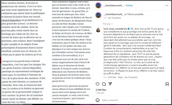 Lucas expresó su indignación en Instagram tras descubrir que Abril firmó el controvertido artículo en apoyo a Depardieu. De esta forma la actriz, en un post ya borrado pero del que aún circulan capturas en redes sociales, acusa a Abril de “numerosos ataques, incluidas agresiones sexuales” contra varios compañeros de rodaje.
