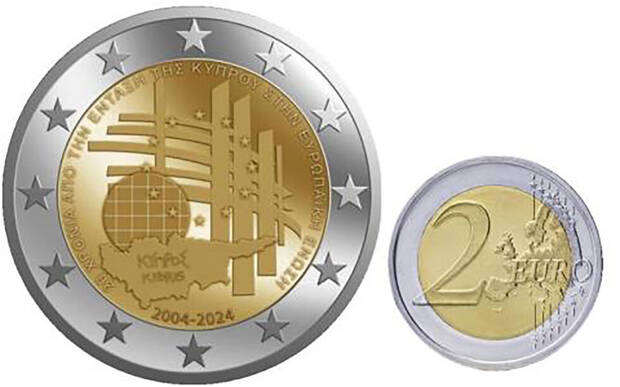 Esta moneda, que por un lado conserva el diseño estándar de los dos euros, destaca por su cara personalizada. La silueta de Chipre, junto al edificio del Parlamento Europeo de Estrasburgo, simboliza su integración en la Unión Europea. Además, un globo terráqueo en el diseño busca destacar el papel estratégico del país en la geopolítica actual, especialmente en la entrega de ayuda humanitaria a regiones en crisis, como la Franja de Gaza. Todo esto está acompañado por la inscripción en griego "20 ΧΡΟΝΙΑ ΑΠΟ ΤΗΝ ΕΝΤΑΞΗ ΤΗΣ ΚΥΠΡΟΥ ΣΤΗΝ ΕΥΡΩΠΑΪΚΗ ΕΝΩΣΗ" (20 años desde la adhesión de Chipre a la Unión Europea), junto a las fechas "2004-2024".