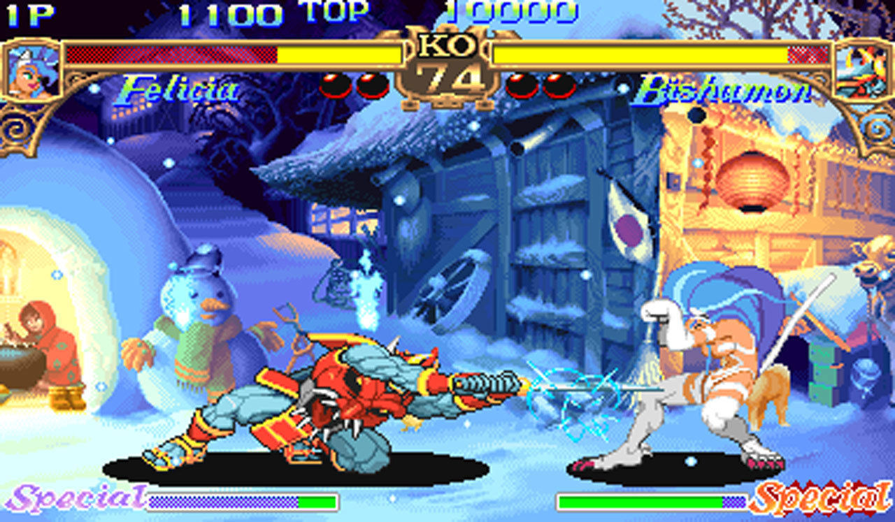 La lucha tenía tanto potencial que era imposible que Capcom no quisiera explotar el género con un complemento para Street Fighter II. Así nació Darkstalkers o Vampire: The Night Warrior, un título que enfrentaría a todo tipo de monstruos típicos del cine o la literatura. La saga destacó por el carisma de sus personajes, todos únicos en personalidad y habilidades. Muchos versus se limitaban a imitar el estilo de Street Fighter y resultaban clónicos, pero Capcom supo hacer de Darkstalkers un juego original, con una estética anime muy llamativa que gustó mucho a la comunidad.