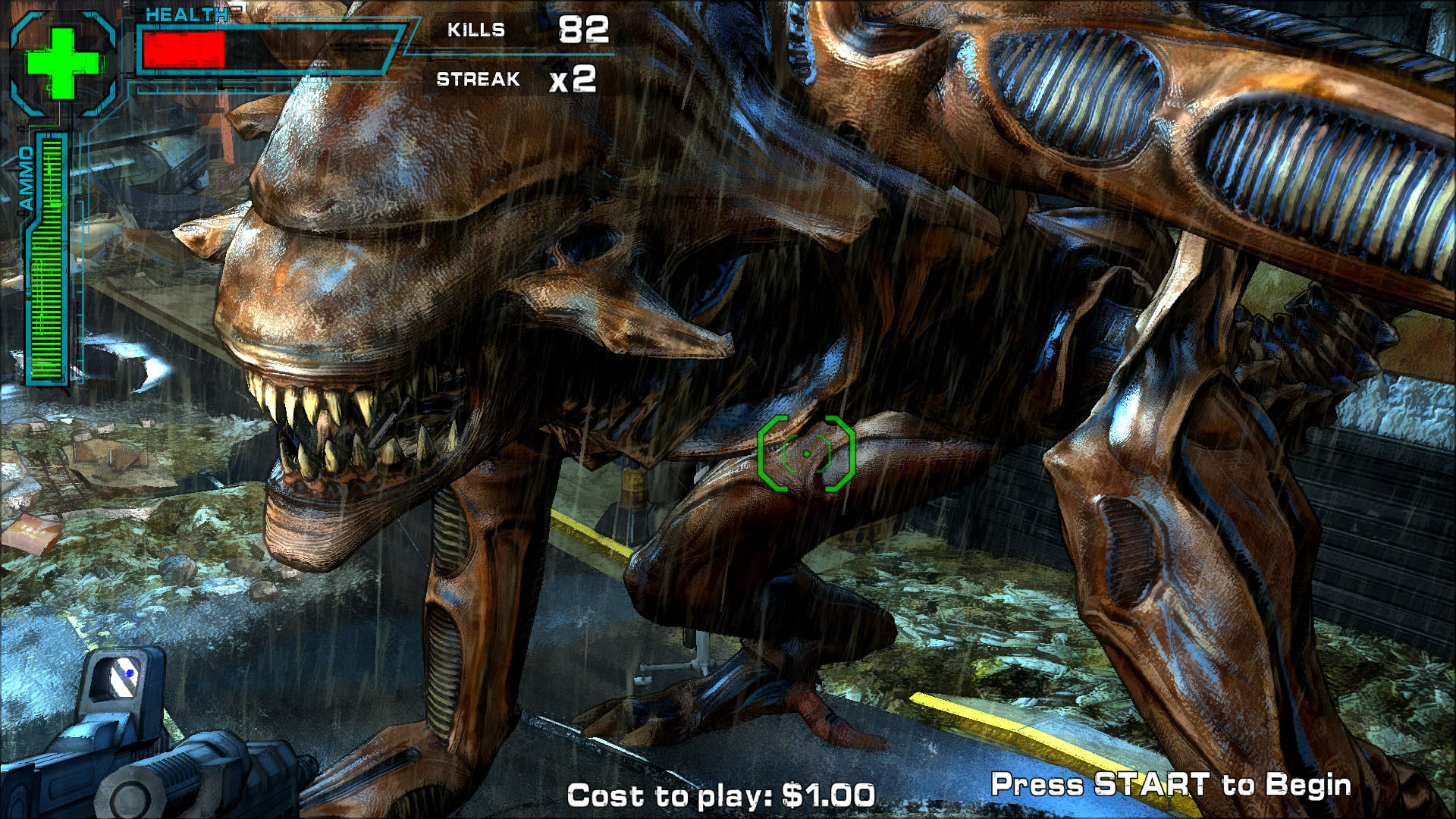 Volviendo a los salones recreativos -pero en una época completamente distinta a la de Alien 3: The Gun-, los xenomorfos invadieron la Tierra con Aliens: Armageddon, un shooter sobre raíles desarrollado por Play Mechanix y Raw Thrills que nos llevaba a vivir una invasión de xenomorfos en nuestro planeta. Era un título bien avenido técnicamente, con múltiples armas, una cabina vistosa y cuatro capítulos de ambientación distinta.