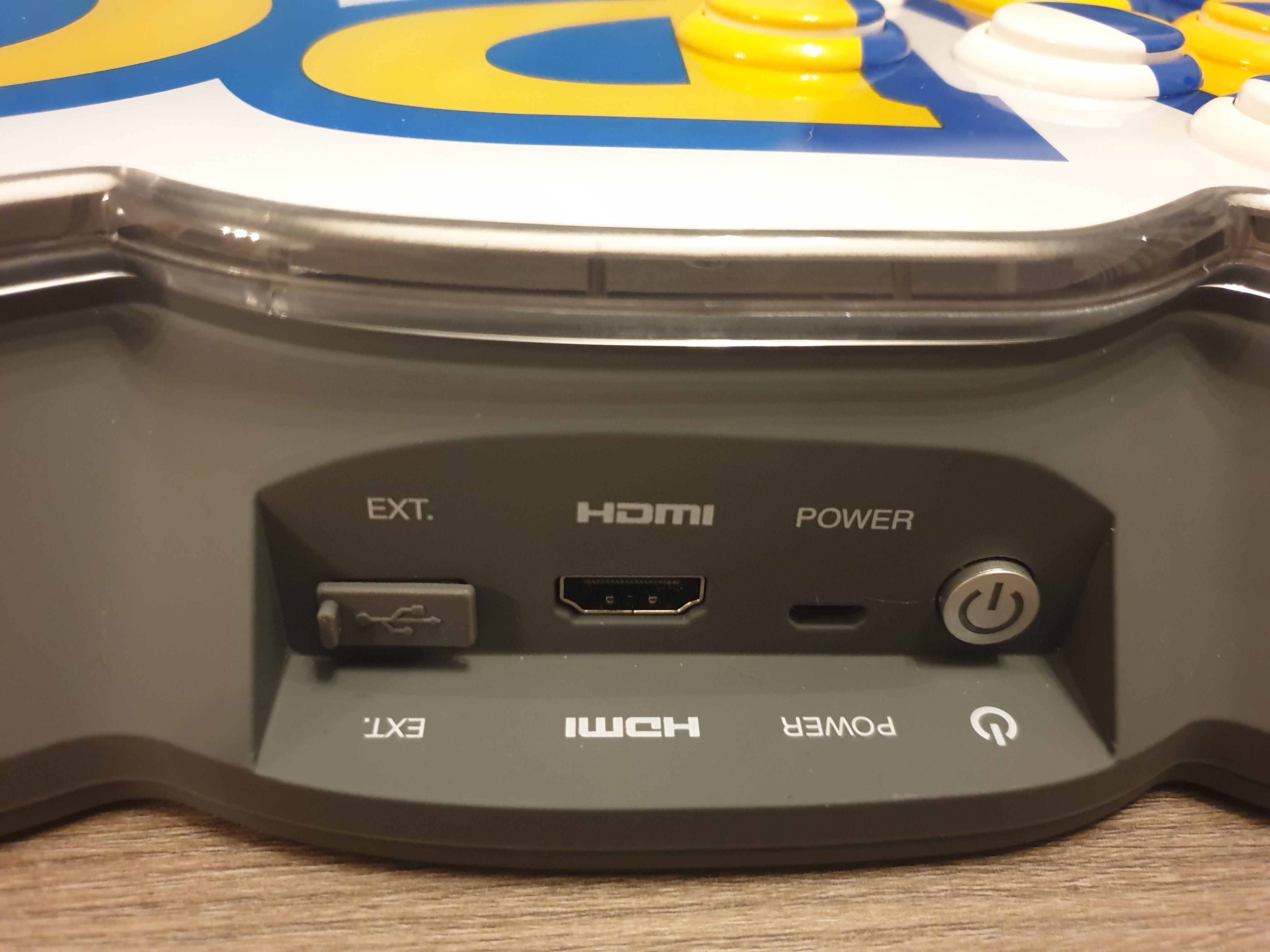En lo referente a los contenidos que nos encontraremos dentro de la caja, comentar que la consola viene acompañada por un cable HDMI de 2,5 metros y otro Micro USB de la misma longitud, así como un adaptador de corriente por si preferimos conectar este último a un enchufe en vez de a otra fuente de alimentación. Las conexiones y el botón de de encendido se encuentran en el lateral de la parte superior, justo donde está la letra P, donde también veremos una ranura para enchufar dispositivos externos mediante USB, aunque en el manual de instrucciones no nos indican cuáles son compatibles y su utilidad ahora mismo nos parece un tanto relativa.