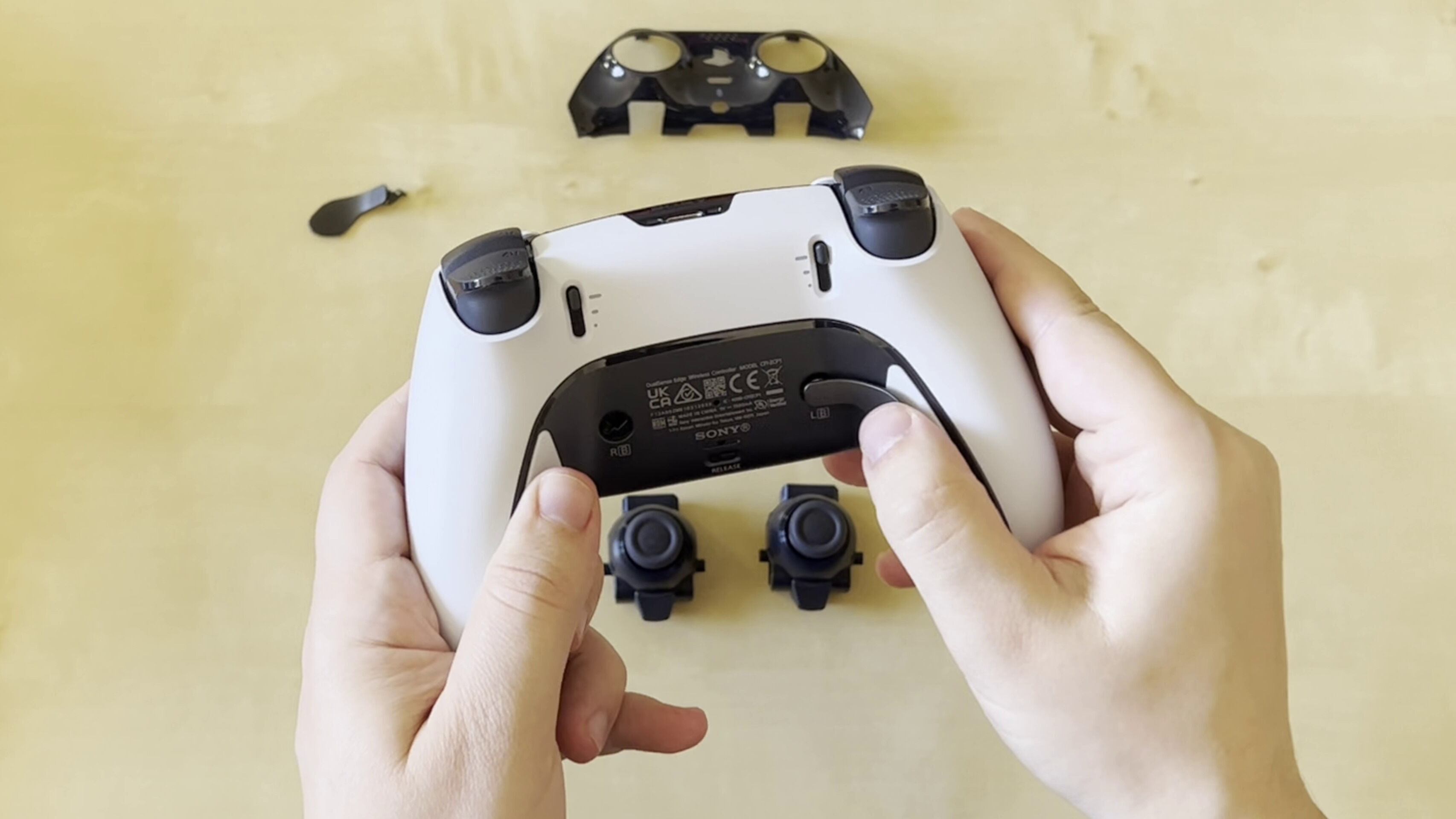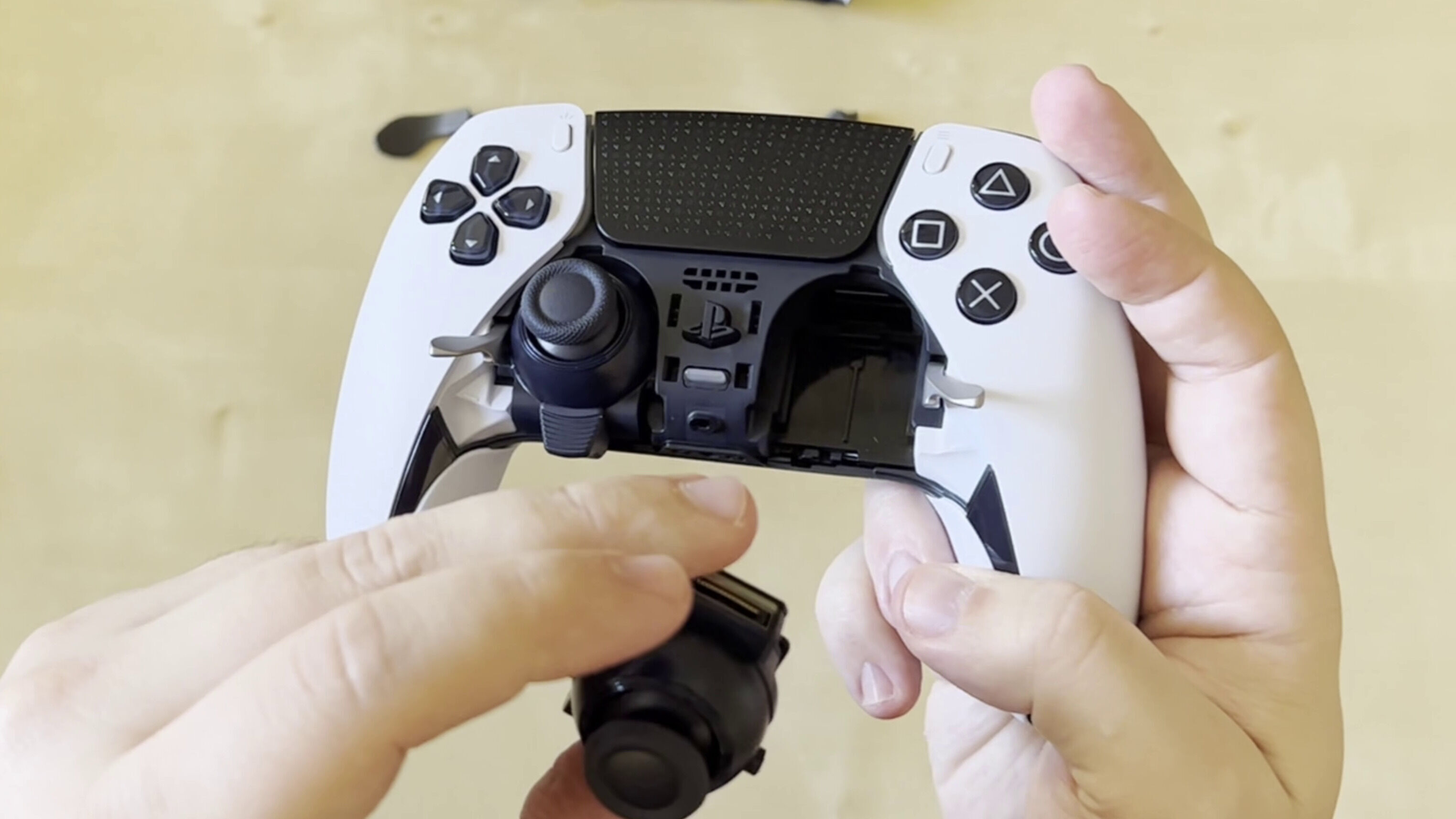 A nivel de hardware lo más espectacular a nivel "visual" son los sticks extraíbles que podemos retirar de forma sencilla pulsando el botón release trasero, quitando la tapa que los recubre y levantando unas pequeñas palancas de seguridad que se van a asegurar de que posteriormente queden bien insertados. Es un proceso fácil de ejecutar, como todo lo que propone el DualSense Edge que es un mando muy bien diseñado para que pueda usarlo cualquier tipo de público incluyendo los primerizos con este tipo de mandos. Eso sí, se trata de un detalle más espectacular para nuestros ojos que otra cosa, ya que los sticks son exactamente iguales a los del DualSense original y el motivo de extraerlos es poder sustituirlos en el futuro cuando se desgasten sus mecanismos o si acaba habiendo algún fallo.