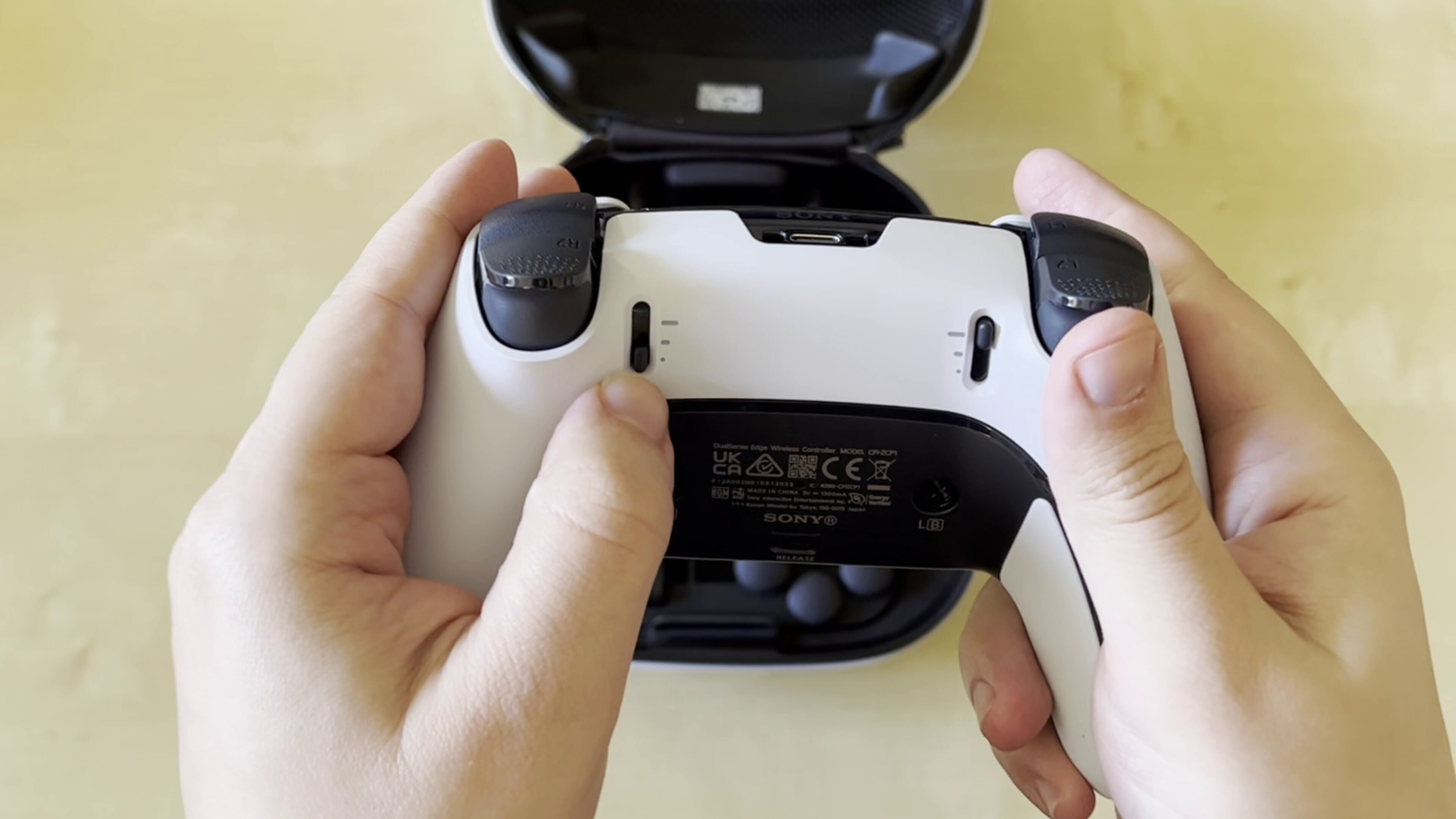 Al dar la vuelta el mando vemos también otras diferencias como el botón para extraer la carcasa de los sticks anteriormente mencionada, los huecos para insertar las palancas traseras y los topes para regular el recorrido de los gatillos adaptativos.