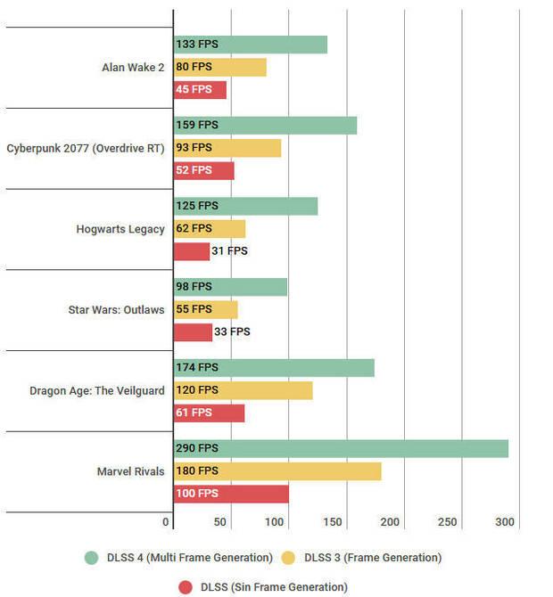 Y es que además de reescalar y suavizar imágenes para ofrecernos una calidad muy buena y dar un salto de rendimiento, DLSS 4 ahora es capaz de generar hasta 3 frames por cada frame creado por la gráfica de forma natural lo que en condiciones óptimas puede llegar a mejorar hasta 8 veces el rendimiento del renderizado clásico (que no use ningún sistema de reescalado), todo ello además con menos coste de VRAM y sin aumentar la latencia con respecto a DLSS 3 gracias al sistema Reflex 2.