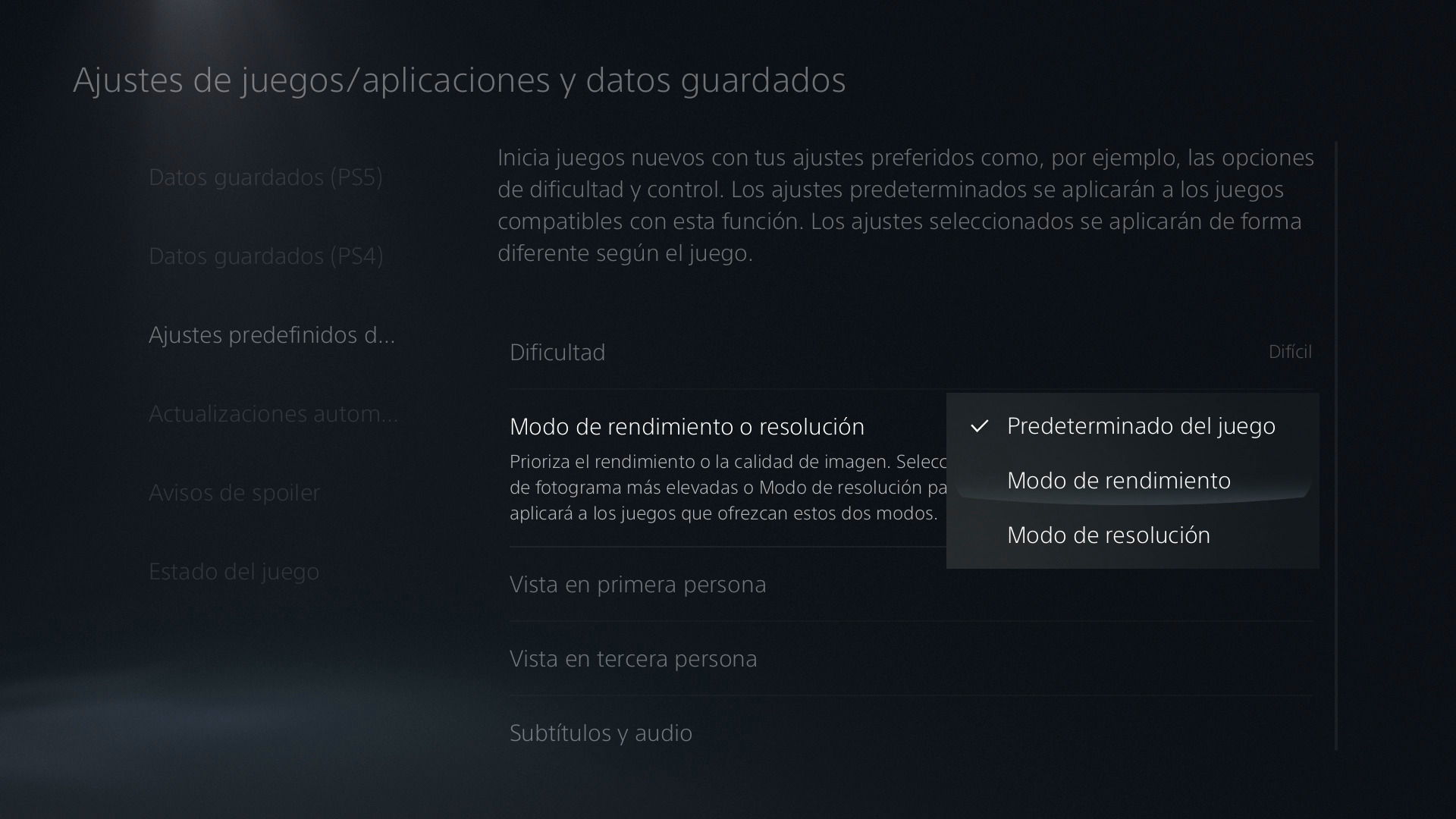 Entre las opciones de configuración de la consola tenemos más o menos lo mismo que podíamos encontrar en PS4, aunque hay un menú de configuración que nos ha parecido especialmente curioso, 'ajustes predefinidos de los juegos', en el que podemos elegir la dificultad por defecto a la que queremos que arranquen todos los juegos, o si queremos que se inicien en modo visual 'rendimiento' o 'resolución', algo que parece va a ser bastante habitual en PS5, al menos con los títulos de PlayStation Studios. Otro aspecto a destacar es que ahora podemos capturar vídeos a 4K con el botón Share, con una calidad enorme, y a 1080p guardar en vídeo cualquier cosa que hayamos hecho en la última hora de juego.