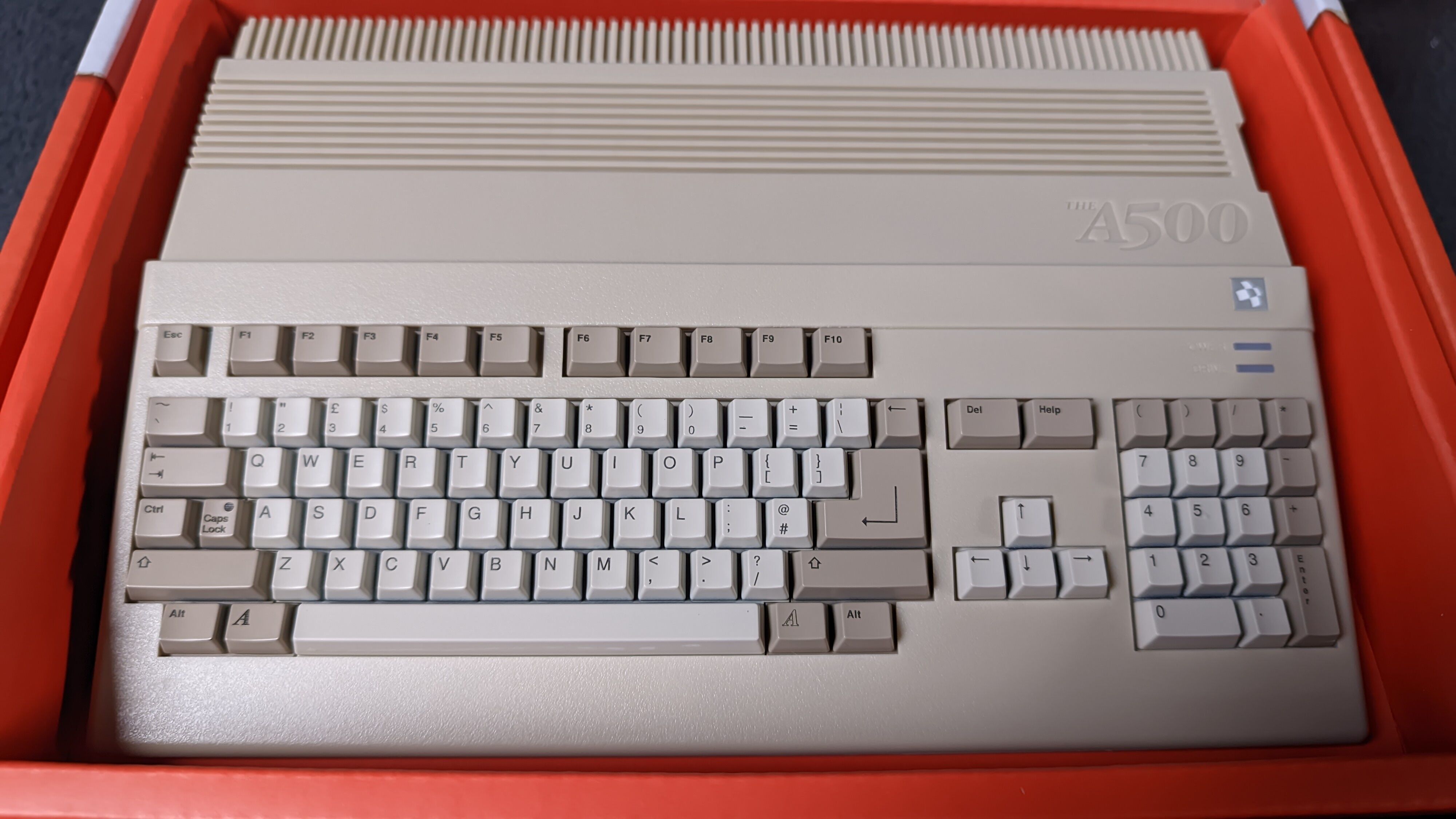 Sacando ya la consola de su caja, TheA500 Mini cuenta con un aspecto idéntico al de la Amiga 500 original a excepción de un par de detalles estéticos como el logo de Commodore que se sustituye por el de Amiga y el nombre de Amiga 500 que se cambia por el de TheA500.