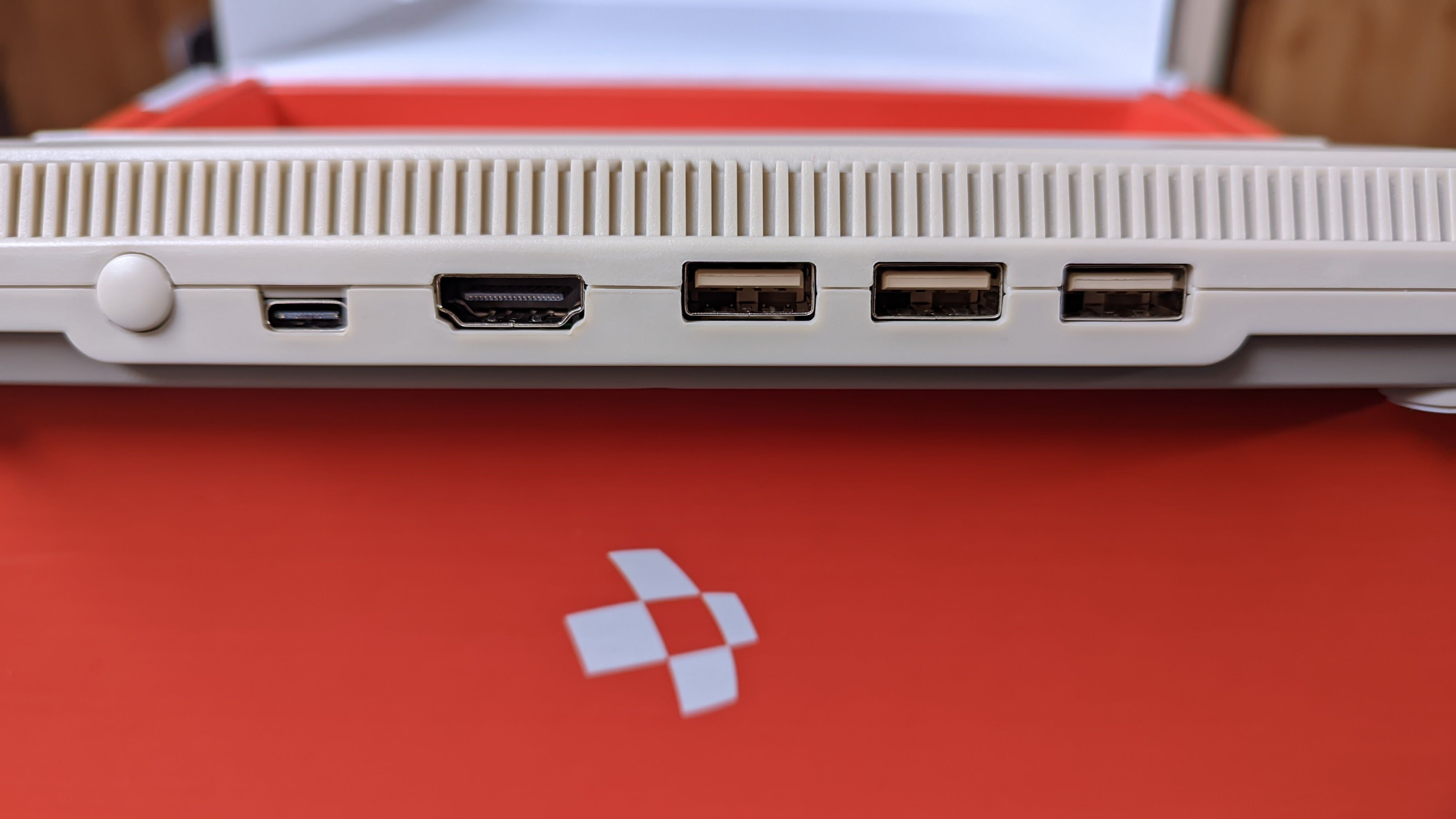 Además en la parte trasera se sustituyen las conexiones de la Amiga 500, como es lógico, por los puertos que necesitamos para hacer funcionar TheA500 Mini en 2022 contando con 3 USB Tipo A acompañados de un HDMI para conectarla a nuestro televisor, el botón de encendido y un USB-C para suministrar corriente a la consola, puntualizando aquí que se incluye el cable pero no la fuente de alimentación, por lo que necesitaremos usar alguno de un teléfono móvil o conectarla a un USB de nuestro televisor para poder hacerla funcionar.