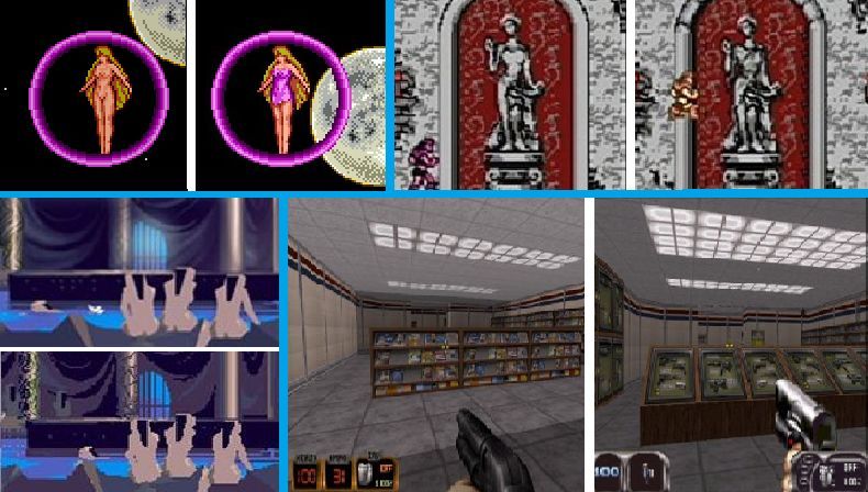 El Mystic Defender (1990) de Mega Drive terminaba con una Alexandra desnuda sobre el jefe final, a la que se vistió con un bonito atuendo rosa para su versión inglesa. De tapar pechos o rediseñarlos también entendió Super Castlevania IV, cuyas estatuas eran unas desvergonzadas. El colmo de lo absurdo es el Another World de Éric Chahi en su versión de Super Nintendo, donde se borró la línea de píxeles que conformaba la rajita del trasero de tres alienígenas. Pero el premio al mayor tijeretazo se lo lleva Duke Nukem 3D de Nintendo 64, con una lista de cambios larguísima: se vistió a las chicas desnudas, película porno fuera, carteles eróticos a la basura y —mi favorita—, la biblioteca para adultos se reemplaza por una armería. ¡Claro que sí!