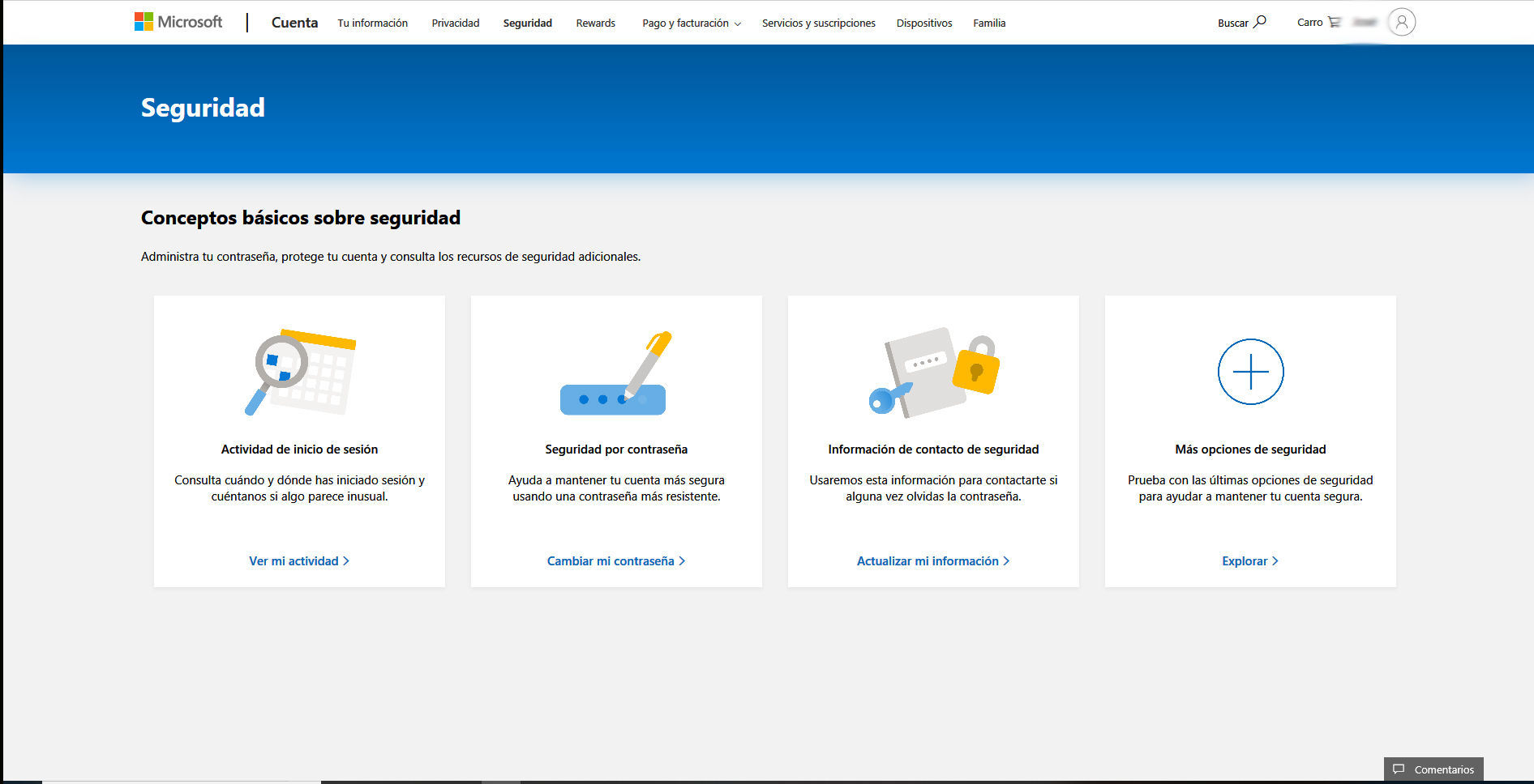 Microsoft muestra un especial interés en que el usuario potencie la seguridad de su cuenta y le anima a introducir la información necesaria para activar la doble verificación. El primer paso es entrar en la cuenta Microsoft desde un navegador y elegir en el menú superior la opción "Seguridad". Primero hay que actualizar la información de contacto de seguridad: se pueden incluir dos cuentas de correo (Microsoft recomienda poner la habitual y otra de respaldo) y un número de teléfono.