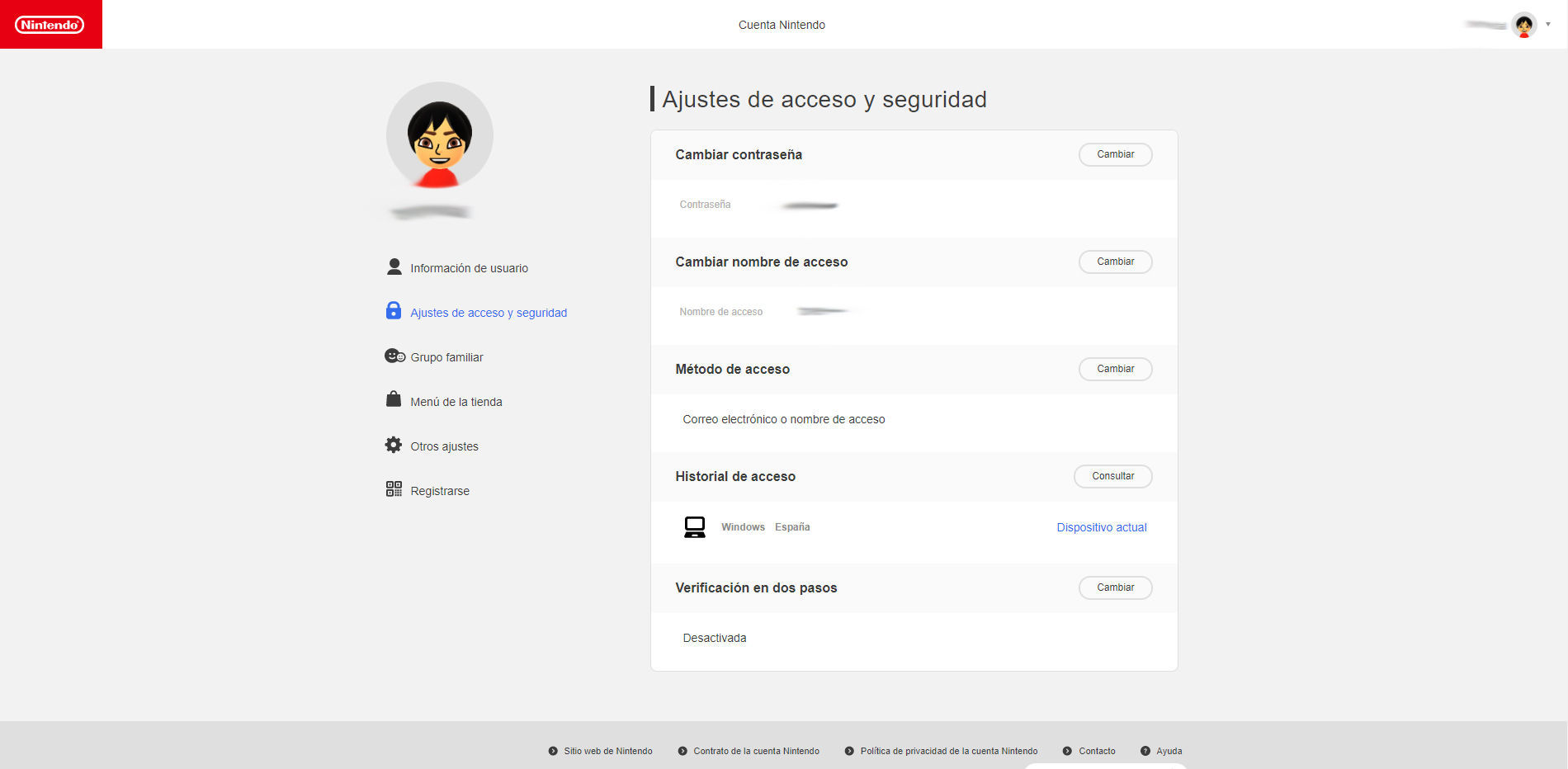 Para contar con esta capa extra de seguridad, hay que iniciar sesión en la cuenta Nintendo. Después, selecciona "Configuración de inicio de sesión y seguridad" y haz clic en el botón "Cambiar" que hay junto a la opción "Verificación en dos pasos".