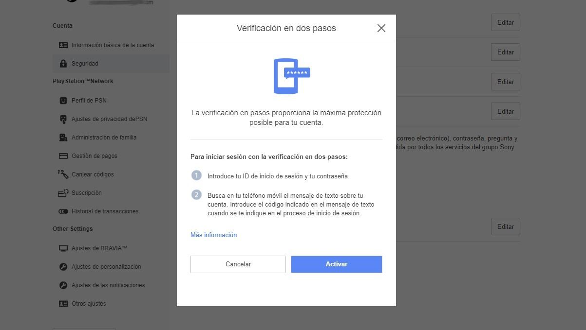 Desde un ordenador hay que ir a la página de PlayStation, entrar en la cuenta de PSN y hacer clic en el símbolo del perfil, que está junto a la opción de "Buscar", en la parte superior derecha de la pantalla. Ahí hay que elegir la opción "configuración de cuenta" e ir al menú "Seguridad". En la parte inferior de esta página está la opción. Aparecerá en estado "inactivo", hay que pulsar en "Editar" y activarla ahí.