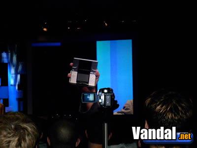 En ese momento se confirmaron nuevos juegos para GameCube y GBA como Donkey Kong o un nuevo Advance Wars que luego descubriríamos que es de GameCube. Volvió Reggie (cuyo apellido, como el lector habrá intuido, no logré apuntar) y cogió el toro por los cuernos. El mercado portátil, dijo, no solo estaba dominado por Nintendo, sino que era de su propiedad. Explicó que PSP era el décimo intento de una compañía por acabar con Game Boy y que, pese a que tendrá un éxito inicial, está condenada al fracaso. Y en ese momento, tras mencionarla un par de veces y mostrar opiniones de gente de la industria como buenas referencias, la mostró. Y era exactamente igual que la imagen que en Vandal Online os ofrecimos hace unas horas y que luego según parece era falsa, y en el momento de escribir esta crónica la imagen ya habrá dado la vuelta al mundo. Una mezcla entre Game Boy Advance y GBA SP, ancha y plegable, con dos pantallas.