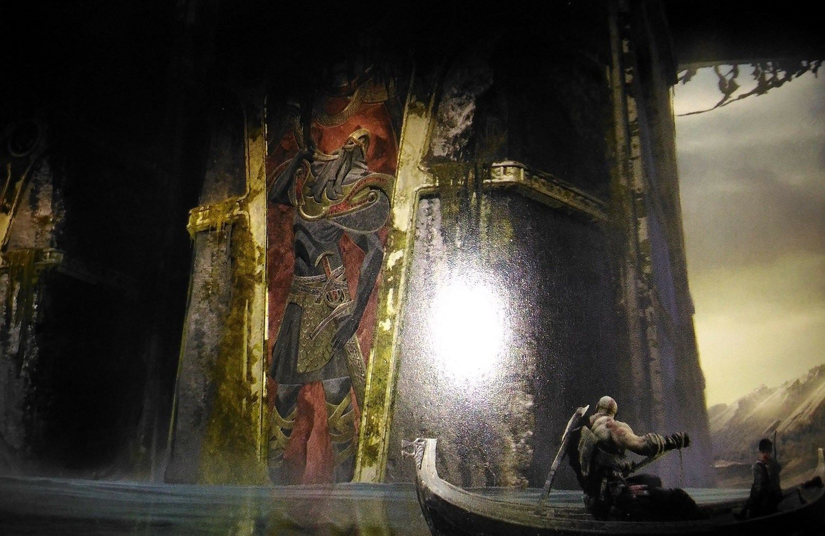 Este grabado levanta muchas incógnitas. No está claro que Jörmundgandr sólo nazca de la boca de Atreus, y sería posible que también esté conectada con Kratos de alguna manera. Podemos ver el grabado completo gracias a una ilustración temprana que aparece en el libro de arte del juego. Además de este nacimiento, también podemos ver cómo Atreus se aleja alegremente rodeado por una manada de lobos.