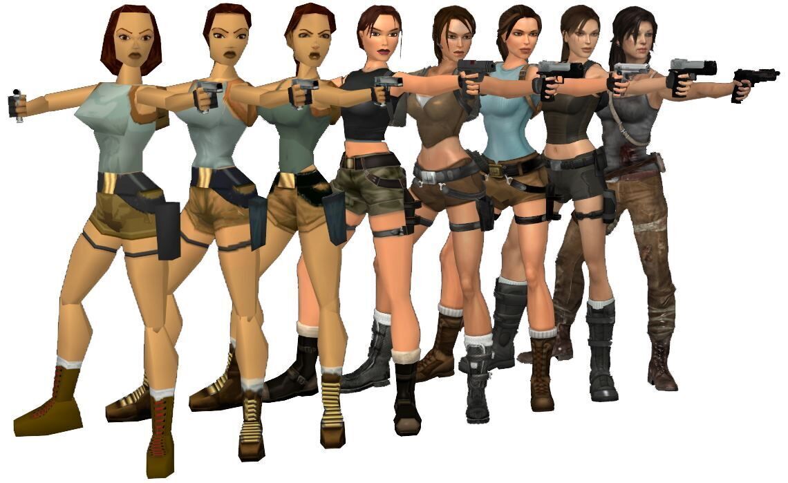 Desde su debut en 1996, Lara Croft ha experimentado una evolución significativa en su diseño físico, reflejando no solo los avances tecnológicos en la creación de videojuegos sino también un cambio en la percepción cultural de los personajes femeninos en la ficción. La franquicia se divide en tres partes, la saga clásica con Tomb Raider (1996), Tomb Raider: The Curse of the Sword (2001), Tomb Raider II (1997), Tomb Raider III: Adventures of Lara Croft (1998), Tomb Raider III: The Lost Artifact (2000), Tomb Raider: The Last Revelation (1999), Tomb Raider Chronicles (2000), Tomb Raider: El ángel de la oscuridad (2003) y Tomb Raider: The Prophecy (2002). Después va la saga L.A.U. con Tomb Raider Anniversary (2007), Tomb Raider Legend (2006), Tomb Raider Underworld (2008), Lara Croft and the Guardian of Light (2010) y Lara Croft and the Temple of Osiris (2014).Después la saga de reinicio o saga survivor con Tomb Raider (2013), Rise of the Tomb Raider (2015) y Shadow of the Tomb Raider (2018). También ha lanzado otros juegos entre medias como The Lara Croft Collection (2023), Tomb Raider Reloaded (2023, )Lara Croft GO (2016), Lara Croft: Relic Run (2015) y Lara Croft: Reflections (2013). Hasta este mismo año que ha lanzado la remasterización de su trilogía original Tomb Raider 1-3 Remastered (2024).