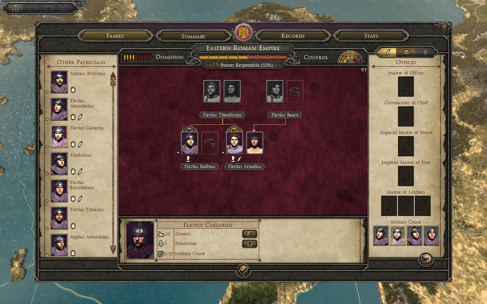 El control es el control sobre un número de senadores, o los jefes, dependiendo de la facción que lleves, y el dominio es la suma de todas las influencias de los personajes de tu facción. De manera que si tienes muchos personajes influyentes esto incrementa tu dominio y si controlas a muchos senadores o jefes esto aumenta tu control. La combinación de estos dos números te dan un poder general.