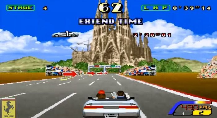 Por ejemplo en OutRunners de recreativa y Mega Drive, en el que corríamos a toda velocidad por diferentes ciudades de todo el mundo, en una de sus carreras pasábamos por la mismísima Sagrada Familia.