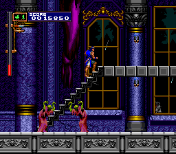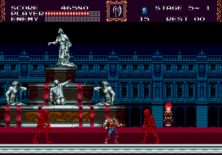 En 1994 Sega recibe su primer Castlevania para la que entonces era su consola de oro, Mega Drive. Hay que empezar diciendo que si bien no era un mal juego en el conjunto de la saga, tampoco fue un título que atesoró gran calidad. Su historia, que en un principio podía parecer bastante interesante puesto que se mezclaban extractos de la novela de Bram Stoker con el mundillo Castlevania, a la hora de la verdad quedaba cuanto menos pintoresca. En el libro original, Quincy Morris moría al matar a Drácula; en Bloodlines se intentó hacer una especie de "enparentamiento" con el mundillo Castlevania de manera que aquí los Morris son parientes americanos (de Texas para ser más exactos) de los Belmont. John, hijo de Quincy, vio como su padre moría y sabiendo que Drácula volvería a revivir juró vengarse y para ello contaba con la ayuda de su amigo Eric Lecarde, que para más inri (ojo al dato) era Alcalde de Segovia y usaba la "Alcarde Spear", traducido en las instrucciones como "lanza de Alcalde" y cuya interpretación original era "Lanza de Alucard". Sin duda estamos ante una de las anécdotas mas curiosas de toda la saga. Una vez comenzaba el juego se nos daba la posibilidad de elegir con quién de los dos queríamos jugar. Morris usaba el Vampire Killer con el que se podía balancear pero el rango de fuerza y utilidad del látigo era ínfima. Eric sin embargo usaba la lanza con tanta destreza como Simon el látigo en el Castlevania IV, pudiéndola incluso usar de pértiga o girarla sobre si mismo para atacar enemigos a ambos lados. Dependiendo de nuestra elección, la ruta variaba en algunos momentos.