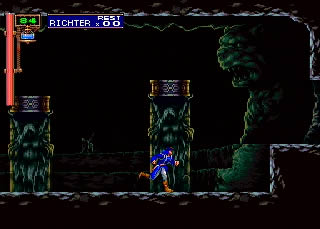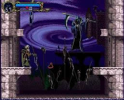 En 1993 llegaría el que está considerado por muchos el mejor Castlevania de corte tradicional. Este juego comenzó a programarse en principio para la malograda Mega CD aunque el proyecto fue rápidamente abortado y transladado a la PC engine CD. Debido a la poca aceptación y nula distribución de ésta consola, Dracula X: Chi No Rinne fue lanzado solamente en Japón bajo formato CD, lo cual permitía muchísimo más espacio y que la música fuera grabada en pistas de CD situando su calidad muy por encima de los cartuchos. El juego es cronológicamente la segunda parte del Castlevania III: Dracula´s Curse de NES y el protagonista de esta entrega era Richter Belmont. La increible intro con look manga nos narraba en un perfecto alemán cómo algunos hombres hartos de la paz recurren al rito de asesinar a una virgen sobre el féretro de Drácula para su resurrección. El vampiro en forma de murciélago corrio a refugiarse a su castillo para urdir un plan que acabase de una vez por todas con la familia que siempre se interponía en sus planes: Los Belmont. Mandó a toda una horda de monstruos que saquean Veros y raptan a varias chicas, entre ellas Annette Renard, novia de Richter y María Renard, hermana pequeña de Annette. Richter se entera de lo sucedido y mediante otra secuencia de animación de lo más espectacular acude a Veros para tratar de ahuyentar a los secuaces de Drácula. En el momento que comenzaba el prólogo ya podíamos notar como el juego aprocvechaba la capacidad del CD y cómo los programadores pusieron además un gran cuidado a la hora de tratar la ambientación. En ese prólogo podemos ver como Richter cabalga en su carreta tirada por un caballo en medio de un bosque lluvioso con 7 planos de scroll y en el fondo aparece la muerte tratando de alcanzarle, una pequeña pelea entre los dos y la Muerte advertirá a Richter que se volverán a ver. Ni que decir tiene que el dibujo de esta "muerte" es el más vistoso y "cool" de todos, ataviado siempre con su gran guadaña y un estiloso sombrero de copa azul.