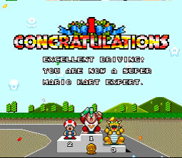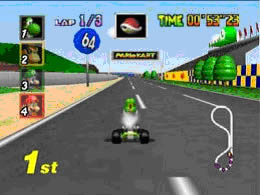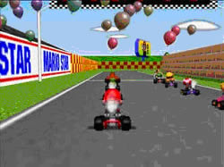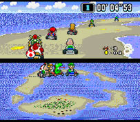 Super Mario Kart (1992) no solo es un juego revolucionario a la hora de jugar, sino que fue el ejemplo máximo de uso del Modo 7 hasta la llegada de Yoshi’s Island. Mario Kart nos pone en la piel de Mario y sus amigos, cada uno de ellos (cosa heredada de Drift y F-Zero) tiene diferentes sistemas de aceleración y cadencia, ajustándose al gusto del jugador. El juego introducía tres campeonatos (uno oculto) y tres diferentes niveles de dificultad o velocidad (50 cc, 100 cc y 150 cc), esto le daba una curva de dificultad admirable. Los circuitos se ubicaban en parajes de Super Mario World cono la isla del donut o la casa de los fantasmas, esto daba una gran variedad al juego y no hacia monótono el discurrir en las pistas (algo muy frecuente en muchos juegos scaling). La banda sonora era prodigiosa y músicas como Koopa Beach todavía resuenan en nuestros oídos, por el contrario el apartado FX era muy limitado, no usando Nintendo FX de calidad hasta la Nintendo 64.