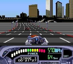 Para la entrañable NES, Activision sacó Galaxy 5000 (1990) al que podemos considerar una versión futurista del clásico RC Pro-Am y que nos trasladaba (como el propio título indica) al siglo 51 para competir en nueve planetas por jugosos premios en metálico. Un juego notable y francamente divertido de la última etapa de la 8 bits de Nintendo. En 1992 y basado en un popular anime de la época Takara sacó para Super Nintendo Cyber Formula (Cyber Spin en USA), carreras en la llamada Formula Cyber donde competíamos en bólidos evolucionados desde los de Formula 1 a velocidades sónicas. Como suele suceder con muchos animes, de esta serie nacieron títulos para GameBoy, Playstation e incluso próximamente visitará GameCube y PS2 con el título Shinseiki GPX Cyber Formula: Road to the Zero aunque seguramente no los veamos por estos lares. La mítica saga Out Run también contó con un capítulo futurista muy peculiar que salio únicamente para Megadrive llamado Out Run 2019 (1993) y que fue programado por la desconocida compañía Sims. Con una mecánica idéntica al original de 1986, competíamos a bordo de veloces deportivos de diseño futurista (parecen batmovil) a través de cuatro fases con diversas rutas a velocidades límite de mas de 1000 Km/h. Una rareza hoy día.