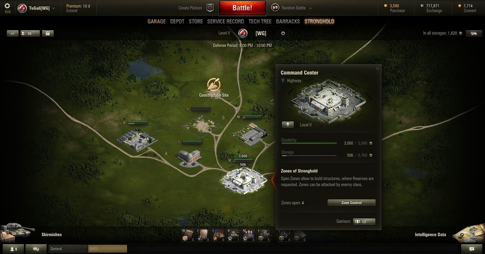 Los jugadores están asignados inicialmente al cuartel general, pero luego cada uno decide si trasladarse a un edificio, de forma que lo que gane en los distintos combates se destina a dicha estructura. A las experiencia y plata que consigue cualquier jugador por participar en una partida se añade en el caso de los clanes los Recursos Industriales, que sirven para construir las estructuras, subirlas de nivel e incluso tener reservas (recursos disponibles un tiempo limitado).