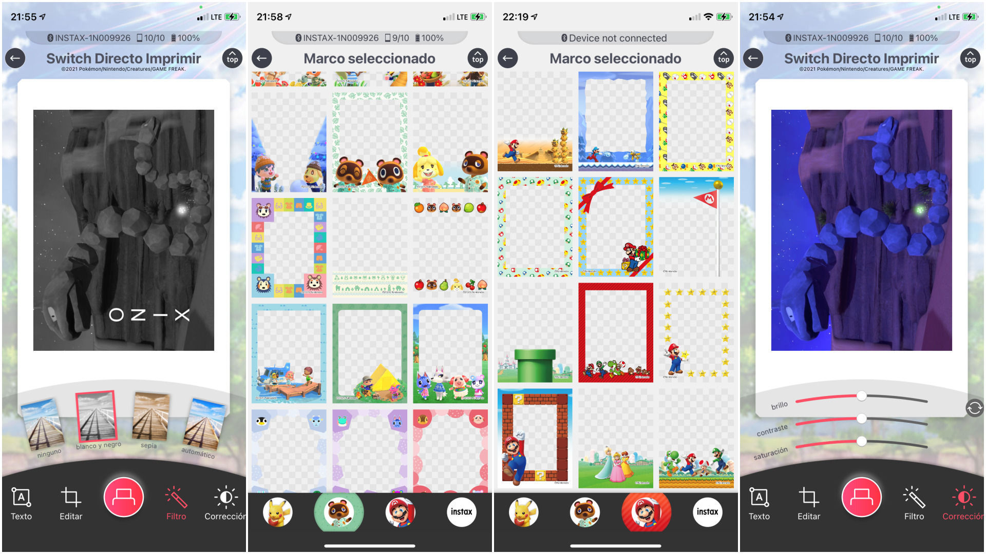 Aunque se puede modificar el contraste, la saturación y el brillo, no hemos conseguido que la instantánea represente correctamente el tono de la fotografía, ya provenga de Nintendo Switch o del carrete virtual de nuestro teléfono inteligente. La otra opción añadida a la versión Switch de la app son marcos de tres juegos: New Pokémon Snap, Animal Crossing: New Horizons y Super Mario, entre 15 y 20 distintos para cada uno, además de marcos Instax de distinto tipo de diseños.