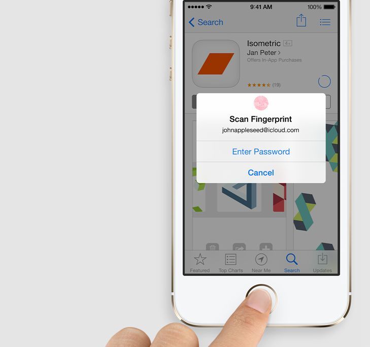 Comenzamos destacando una de las mayores novedades de este dispositivo: por primera vez en la historia del iPhone el botón home viene acompañado de un chip que será capaz de autenticar las huellas dactilares del usuario. Así ha introducido Apple el Touch ID. "Éste es el smartphone más seguro del mercado", han asegurado desde Apple. iOS 7 será capaz de identificar nuestra huella dactilar escaneando las partes interiores de la piel, y no tanto las exteriores. Para desbloquear el iPhone 5S tan solo tendremos que posar nuestro dedo encima del botón home, sin importar la dirección (no más tener que deslizar para desbloquear). Touch ID también nos servirá para autorizar compras en iTunes Store o la App Store, así que nos podemos "olvidar" de la contraseña. La información personal de nuestras huellas no será almacenada en los servidores de Apple.