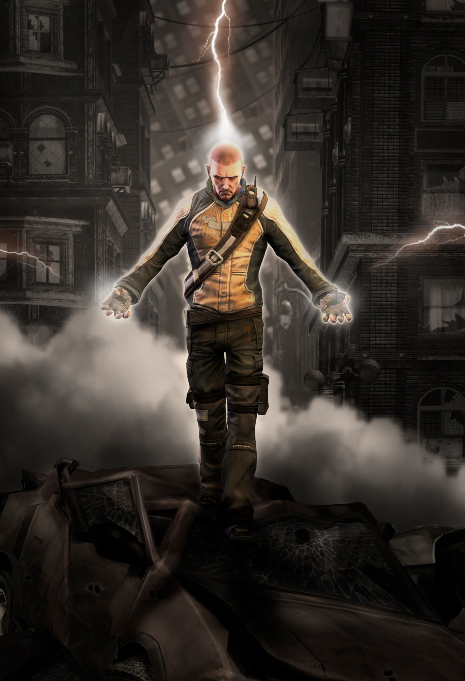 Con esta premisa del personaje que consigue habilidades eléctricas por casualidad se evitó darle una máscara o alter ego. Fox, que había escrito la mayoría de historias de Sly, se encargó de la historia de Infamous, aunque más tarde se reescribieron algunas partes junto a Fleming y se incorporó a Bill Harms, un autor de cómics que también había participado en videojuegos. El tema principal era el progreso de los poderes, y cómo los peligros debían escalar en proporción a sus habilidades, las eléctricas, que se eligieron por las ventajas que ofrecían en ataques a larga distancia y las posibilidades en una ciudad con tantos elementos conectados –cables, carteles, vehículos, etc., siempre hay una fuente de energía cerca-. Aunque originalmente se daba libertad en la compra de los poderes, esto causaba problemas en el diseño de misiones, así que se optó por ir presentando los poderes según avanza la historia. Algunos de estos poderes se cayeron del desarrollo, como el que habría permitido controlar las mentes de los ciudadanos para contar con ayuda extra, porque no lo consideraban especialmente útil –si bien hay una pista de esta idea en una de las misiones de la ruta malvada-.