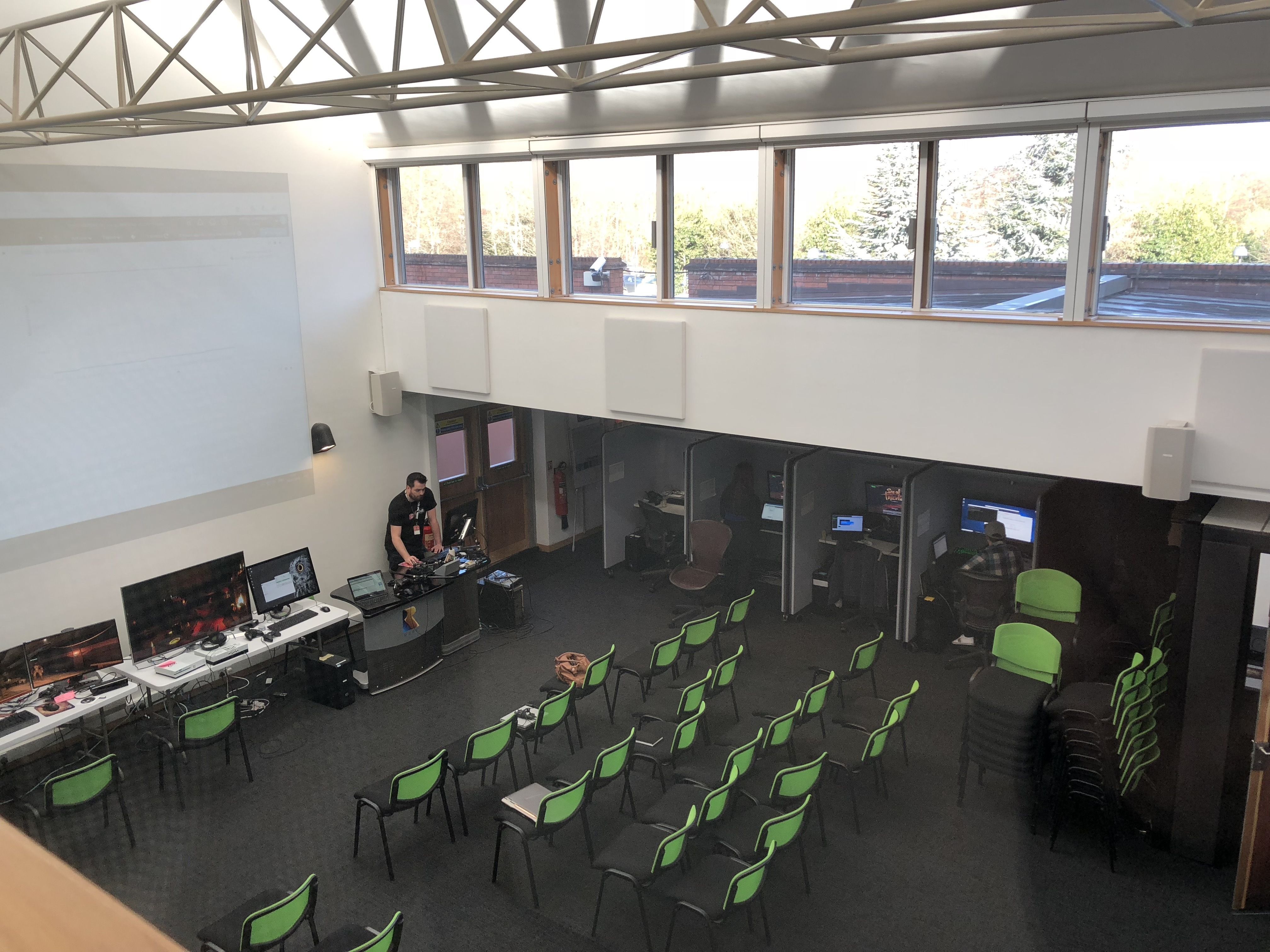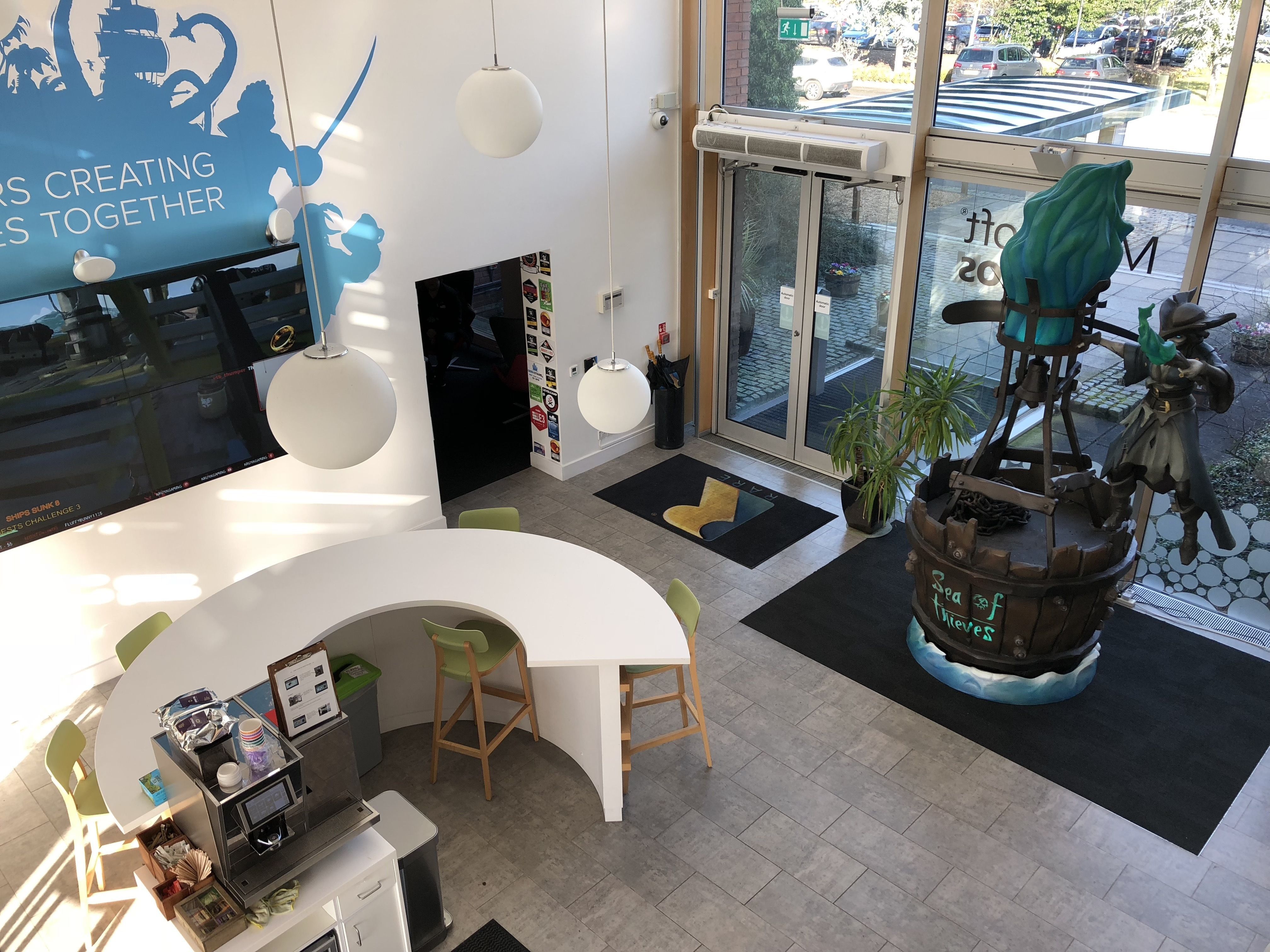 Microsoft nos invitó a viajar hasta las oficinas de la desarrolladora, ubicadas en un pequeño pueblo inglés llamado Twycross. Allí pudimos hablar con varios miembros clave del estudio, probar el juego y ver cómo trabajan. La comunidad es un elemento importantísimo para Sea of Thieves, y prueba de ello es que lo primero que vemos al entrar es una gigantesca pantalla con retransmisiones del juego en Twitch, Mixer o YouTube. Pero profundizaremos en eso más adelante.