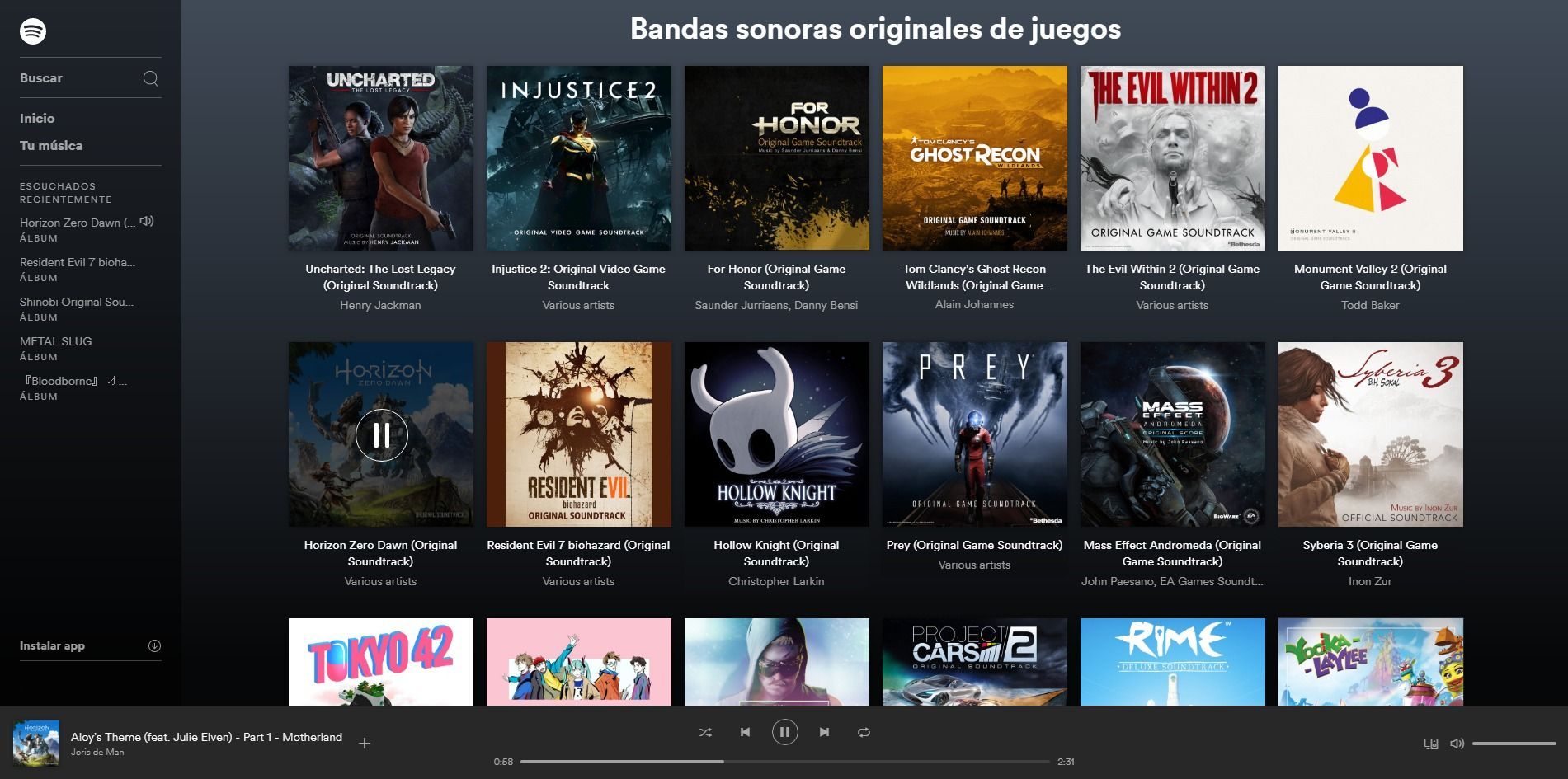 El resultado es una emotiva banda sonora que les ha valido un Jerry Goldsmith Award a Mejor música para un videojuego, grabada con una refinada sección de cuerdas, vientos y voces mixtas entre tenores y sopranos coronada por Julie Elven, la cantante principal. Desde el extenso prólogo de Motherland, la música de Horizon Zero Dawn nos deja momentos para el recuerdo con "Homecoming", la sublime fusión electrónica y clásica de "The Good News", "Her Breath, Her Land", "Meridian" y por supuesto ese "Aloy Theme" que hace de tema principal y lleva las riendas del leitmotiv que desarrolla durante el juego.