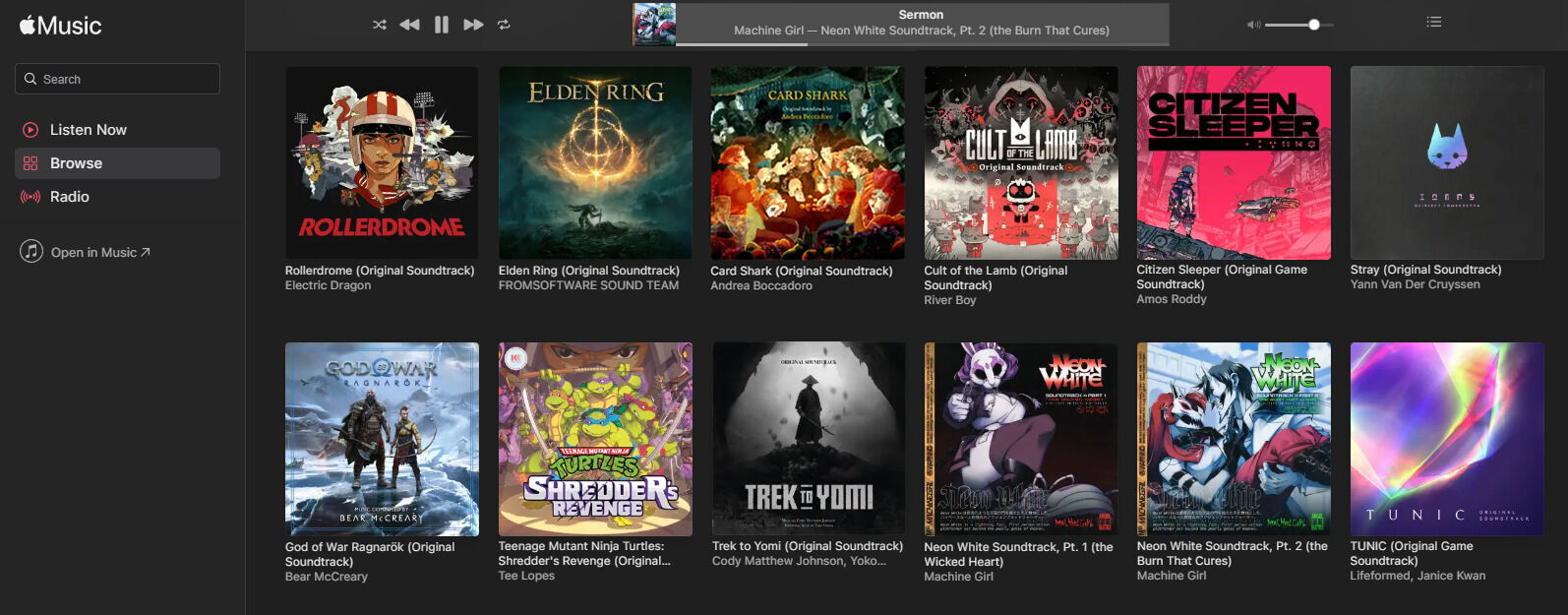 El juego indie que ha recibido mejores críticas este año presenta también una de las mejores bandas sonoras de 2022. La locura de acción desatada perpetrada por Angel Matrix y Annapurna en Neon White se ha saldado con un repertorio original obra del duo neoyorquino Machine Girl. El resultado ha sido una anedralítica mezcla de jungle y drum and bass que funciona a la perfección dentro de los frenéticos niveles del juego.